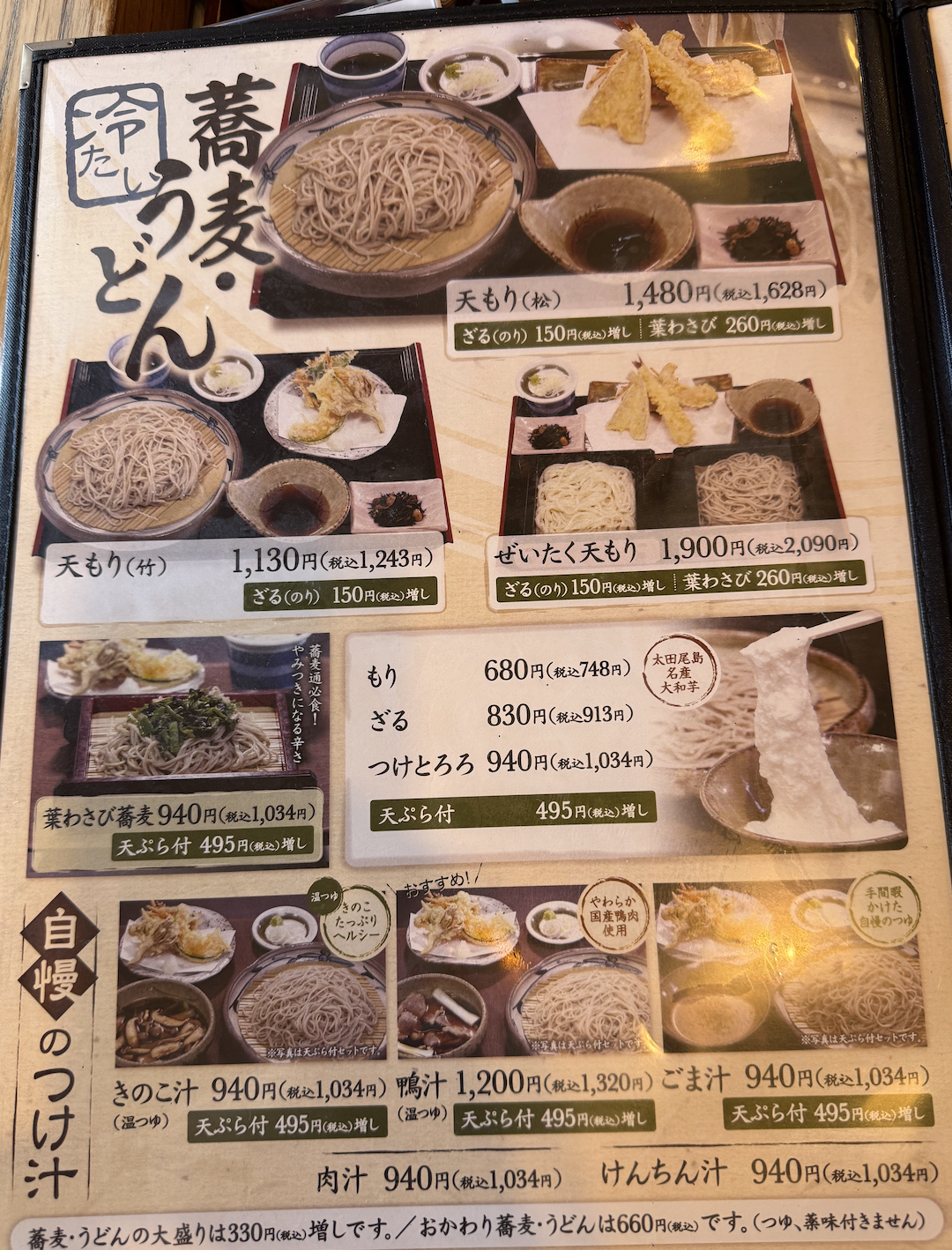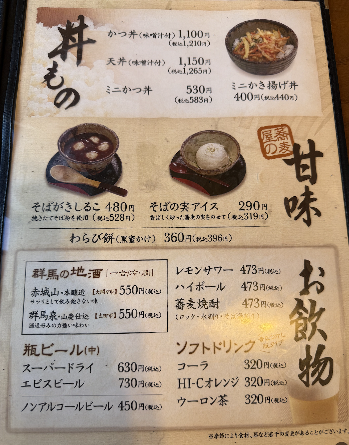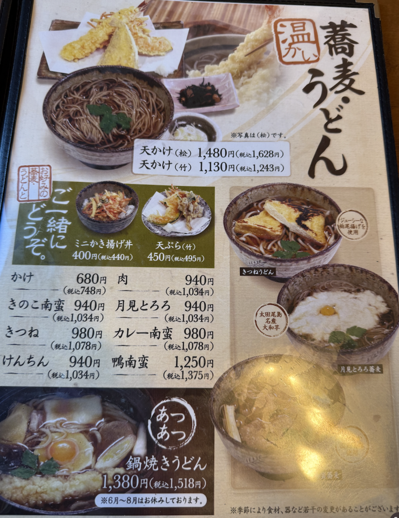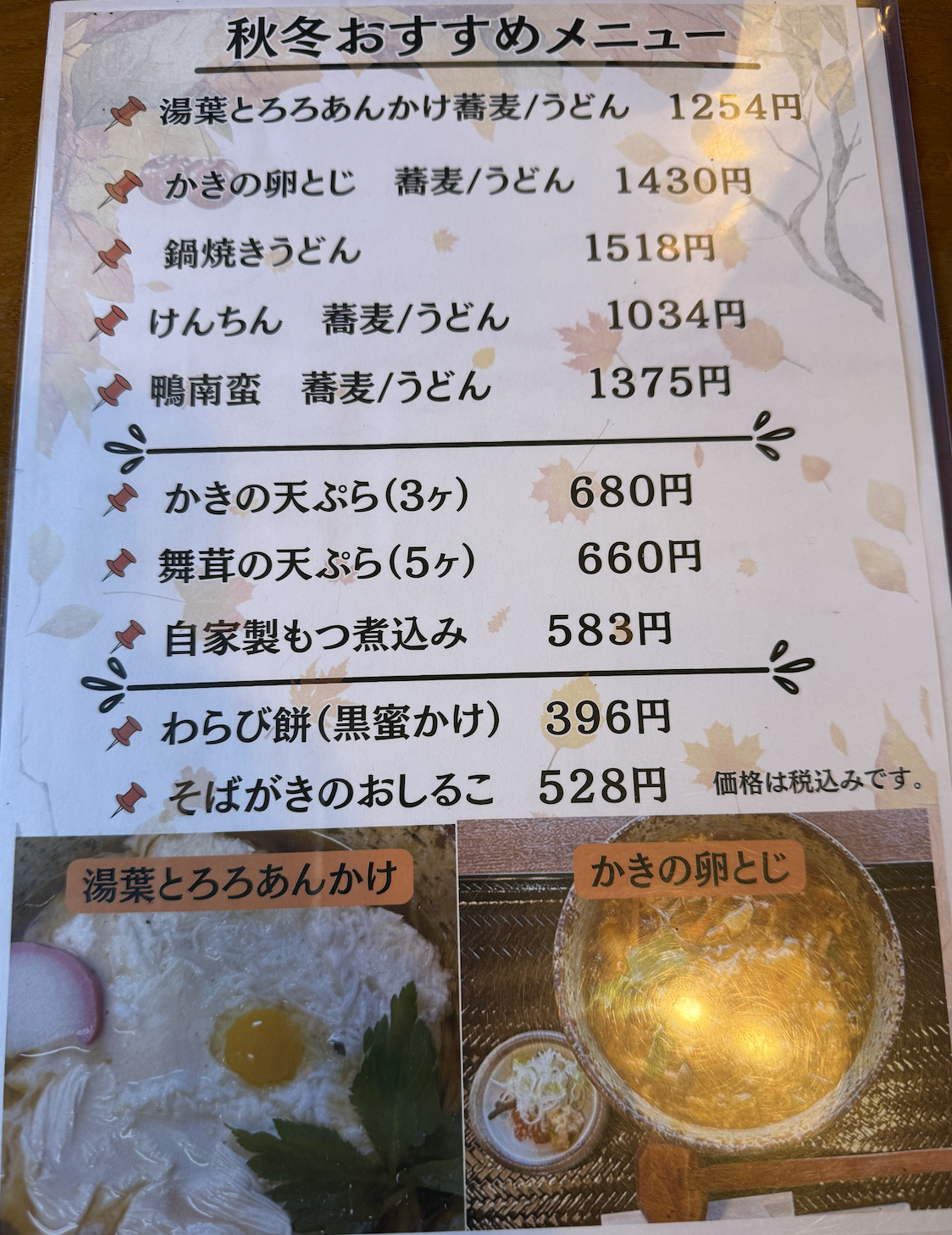 秋冬おすすめメニューには湯葉とろろあんかけ蕎麦やかきの卵とじ蕎麦などチートな響きが。もちろん鴨南蛮も入っているぞ。