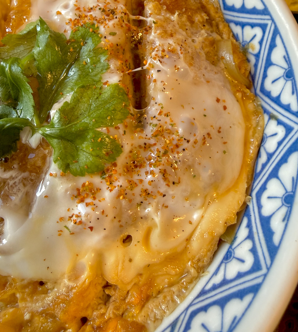 フチの黄身は見るからにフカフカだけど、センターあたりの白身は見事にトロトロ。てっぺんのミツバがなんという美意識。記憶にない罪まで白状してしまいそうだ。