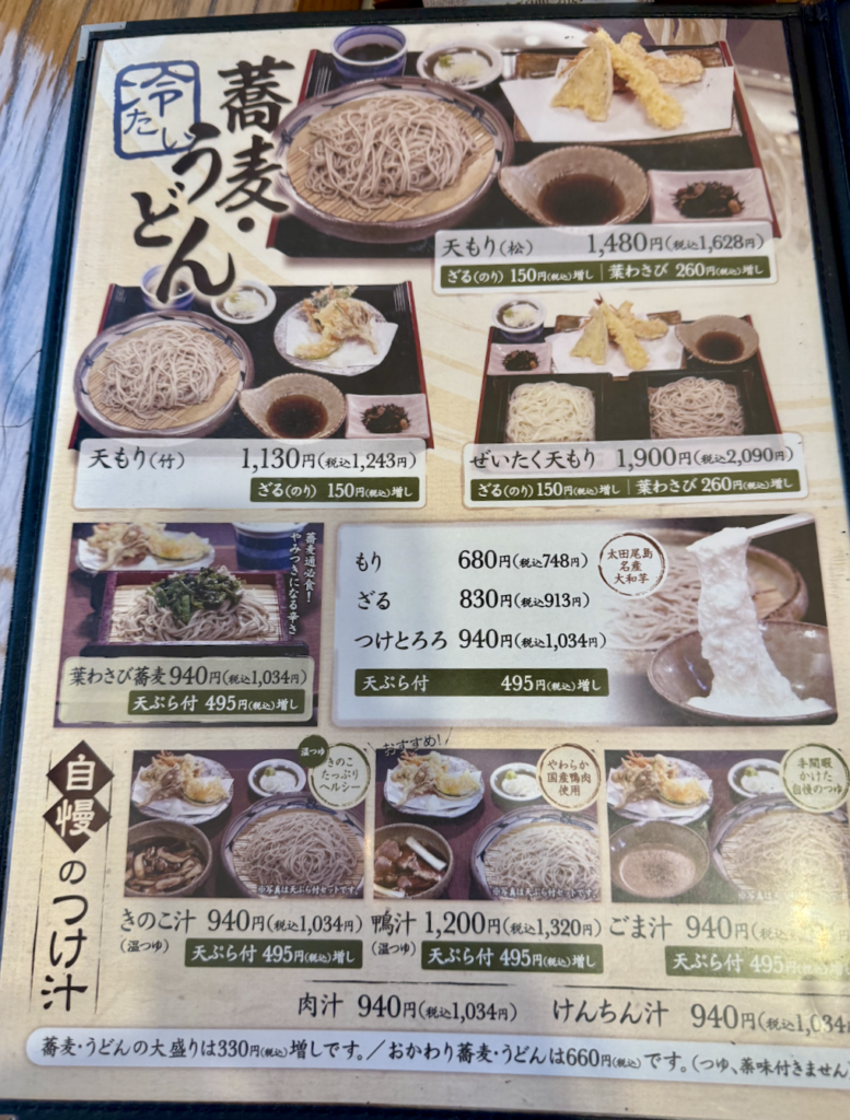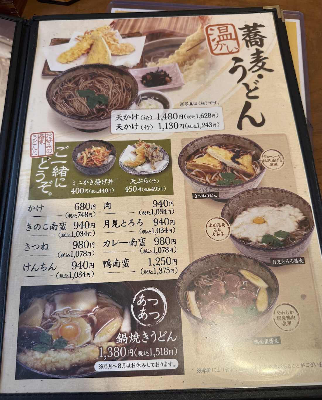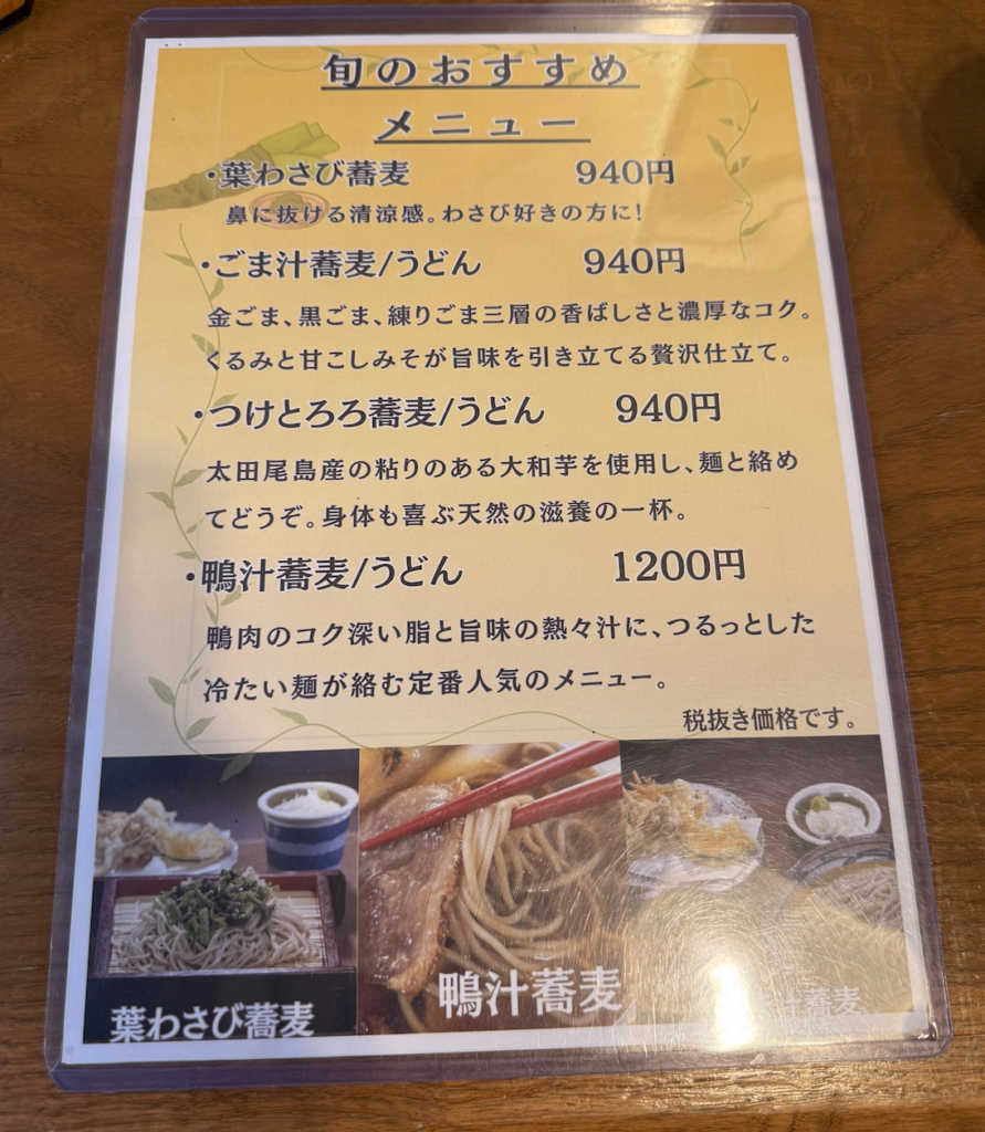 よかった、旬のおすすめに鴨がいた。メニューに背中を押してもらって初志貫徹、鴨汁蕎麦大盛りを願いま〜す。