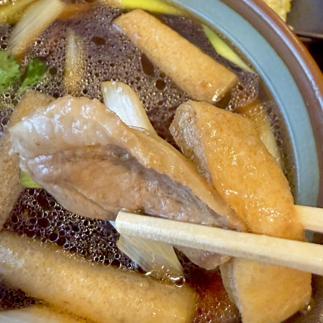うまうま汁が染みた鴨ネギに油揚げ。蕎麦抜きでツマミにしたくなるけしからん。