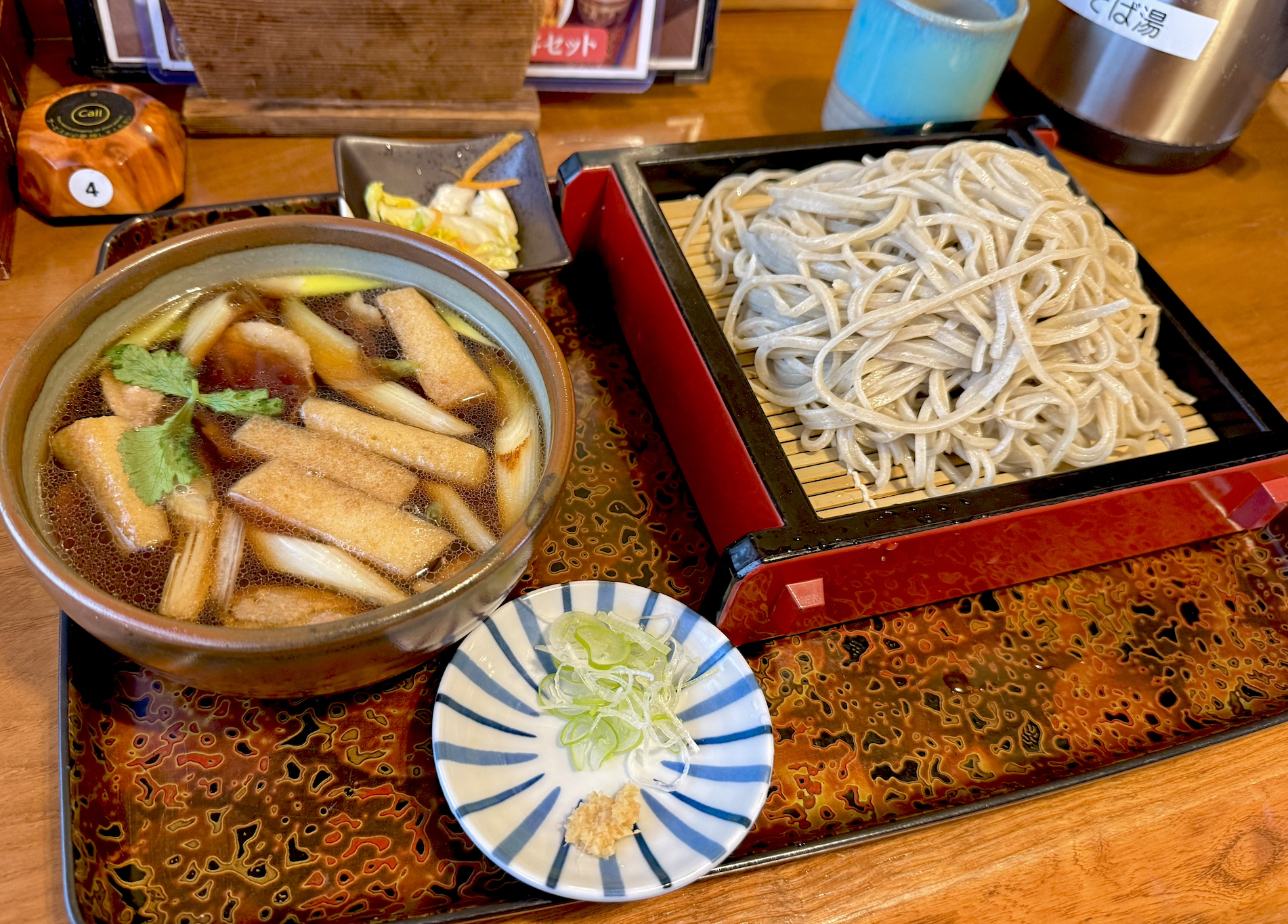 残りネギを全投入して蕎麦湯タイム。卓上にポットで用意されているので、「まだかな〜」なんて店員さんの方をチラ見したりする必要はありません。