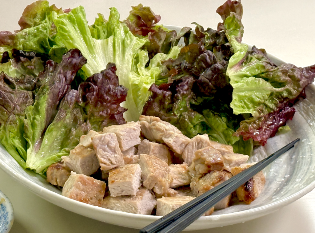 次はレタスで包むポークソテー!しっかりとした味のついた豚をサニーレタスで包んで食べます。包んで食べるって楽しくてうまくていいですね。