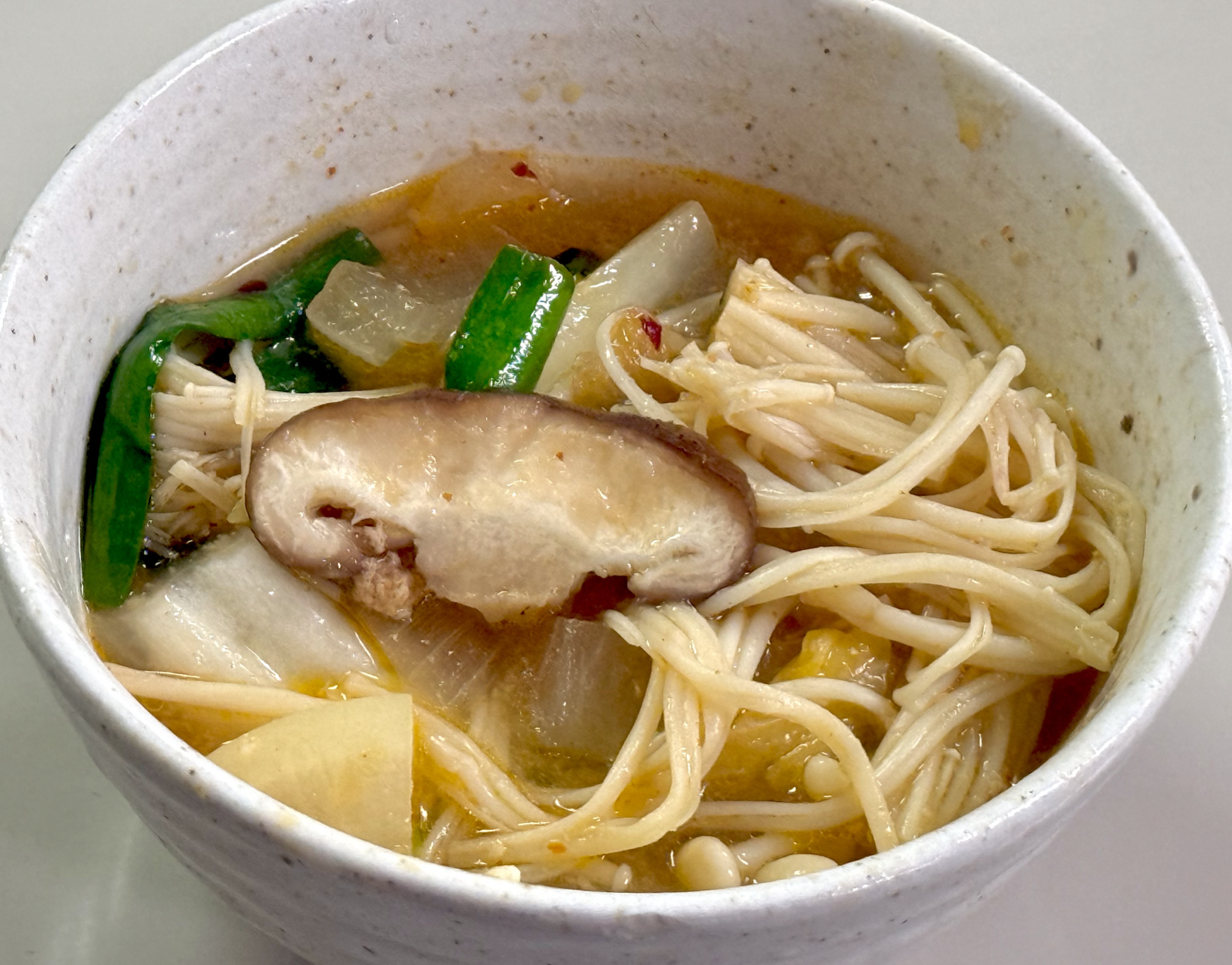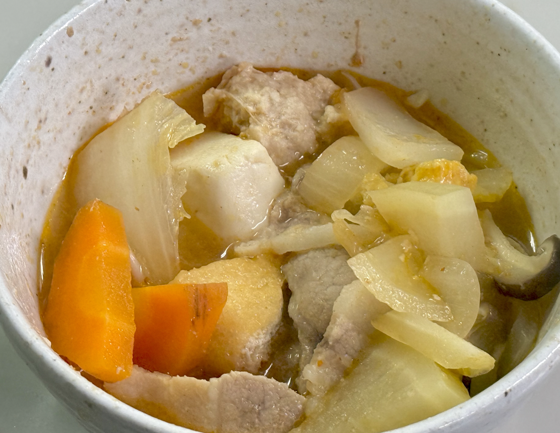 味だけではありません。オタマでざっくりすくっただけで、豆腐に豚肉に油揚げに根菜と、タンパク質から繊維質までオールインワンな一杯に。