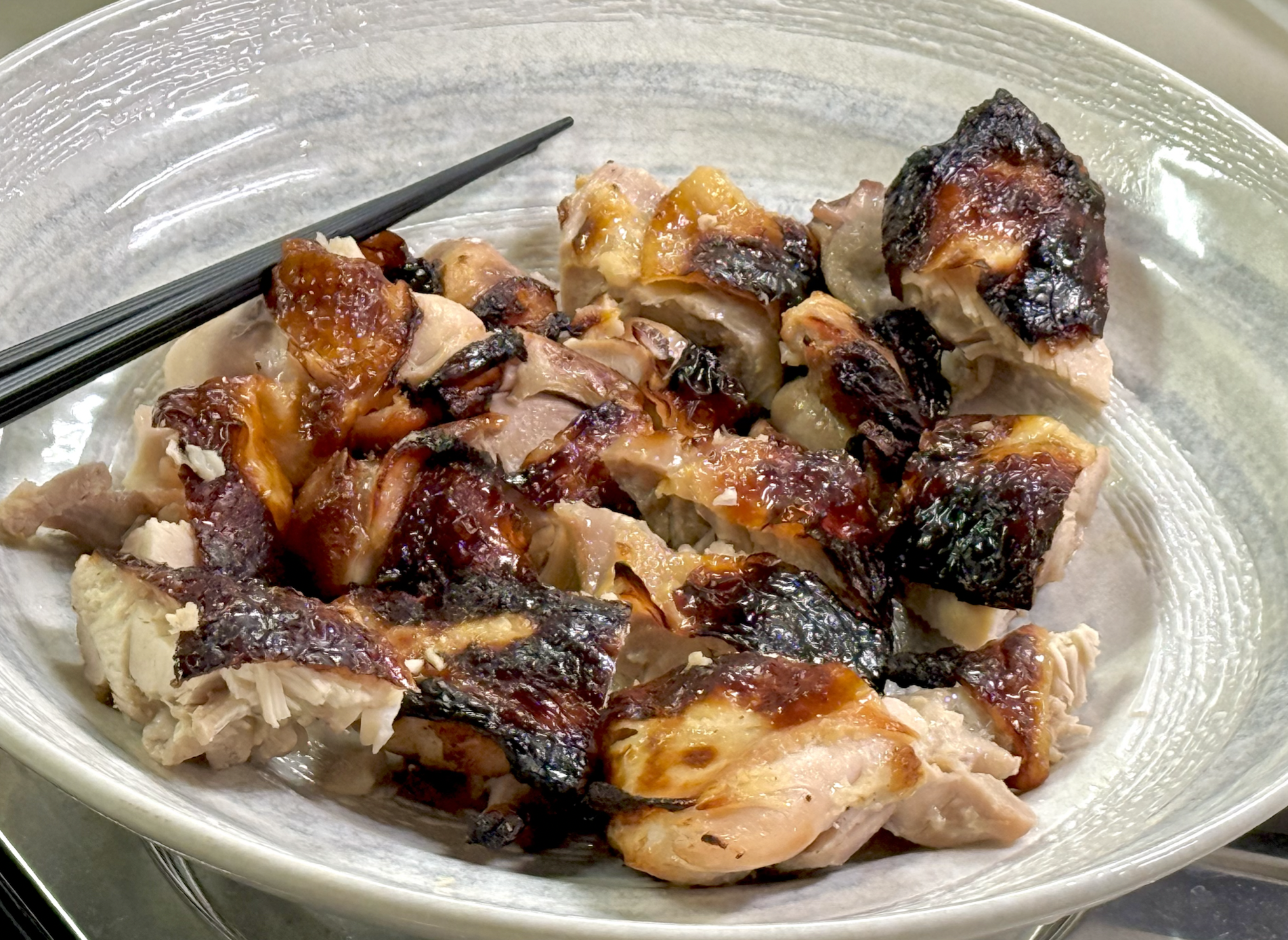北京ダックの技巧を使った、パリパリ中のパリパリチキン。ダックのように皮だけでなく、肉の旨味もぎっちり凝縮。特別注文の品ですが、毎回必ずお願いしてしまいます。