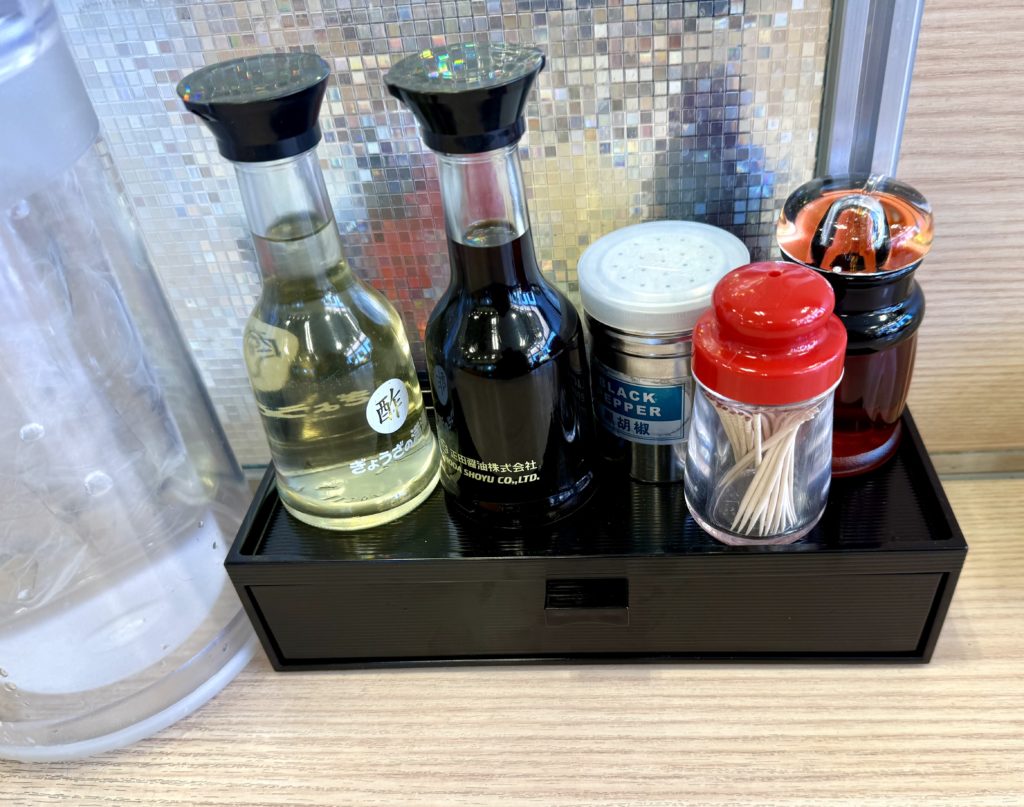 中にもあった引き戸を開けて本当の入店。L字カウンターの隅っこに案内していただきました。すでに冷たいお茶が置いてある所を見ると、食券を買う時に人数を把握しているのかな。