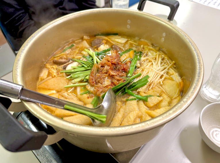 そしてメインのキムチ鍋だーッ!巨大なアルミ鍋にみっちり、5人で食べきれんのかーッ!