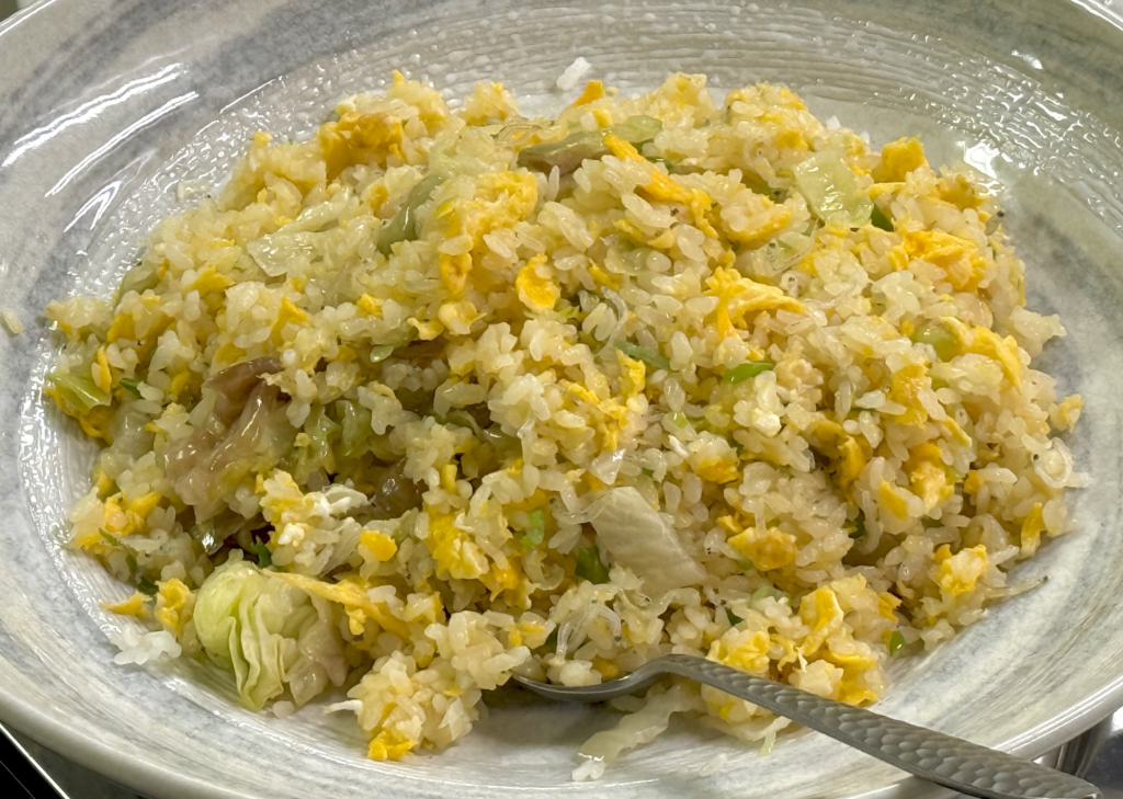 ん?このシャッキリした歯ごたえはレタスですか。そしてコキッとして味の濃い具は‥ジャコだ!こりゃ〜美味しい、こんなにうまく出来るはずはないけど今度マネしてみよう。