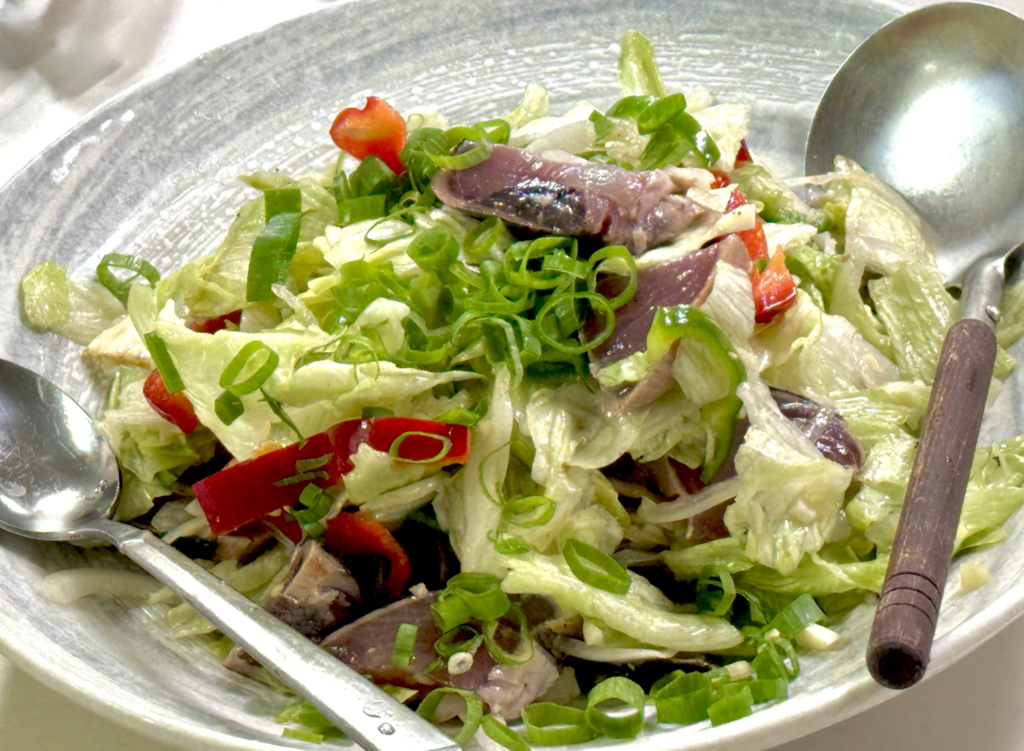 前菜がわりの一発目はカツオの中華風サラダ。ニンニクや香味野菜の風味が舞い踊り、酸味しっかりのドレッシングが味を締める!