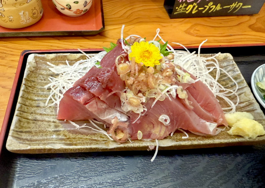 メインの初カツオ刺!もちろん7月にもなって「初」も何もないのですが、脂乗りがそれっぽいということでしょう。つまりサッパリと赤身のおいしさを楽しむカツオということだ。