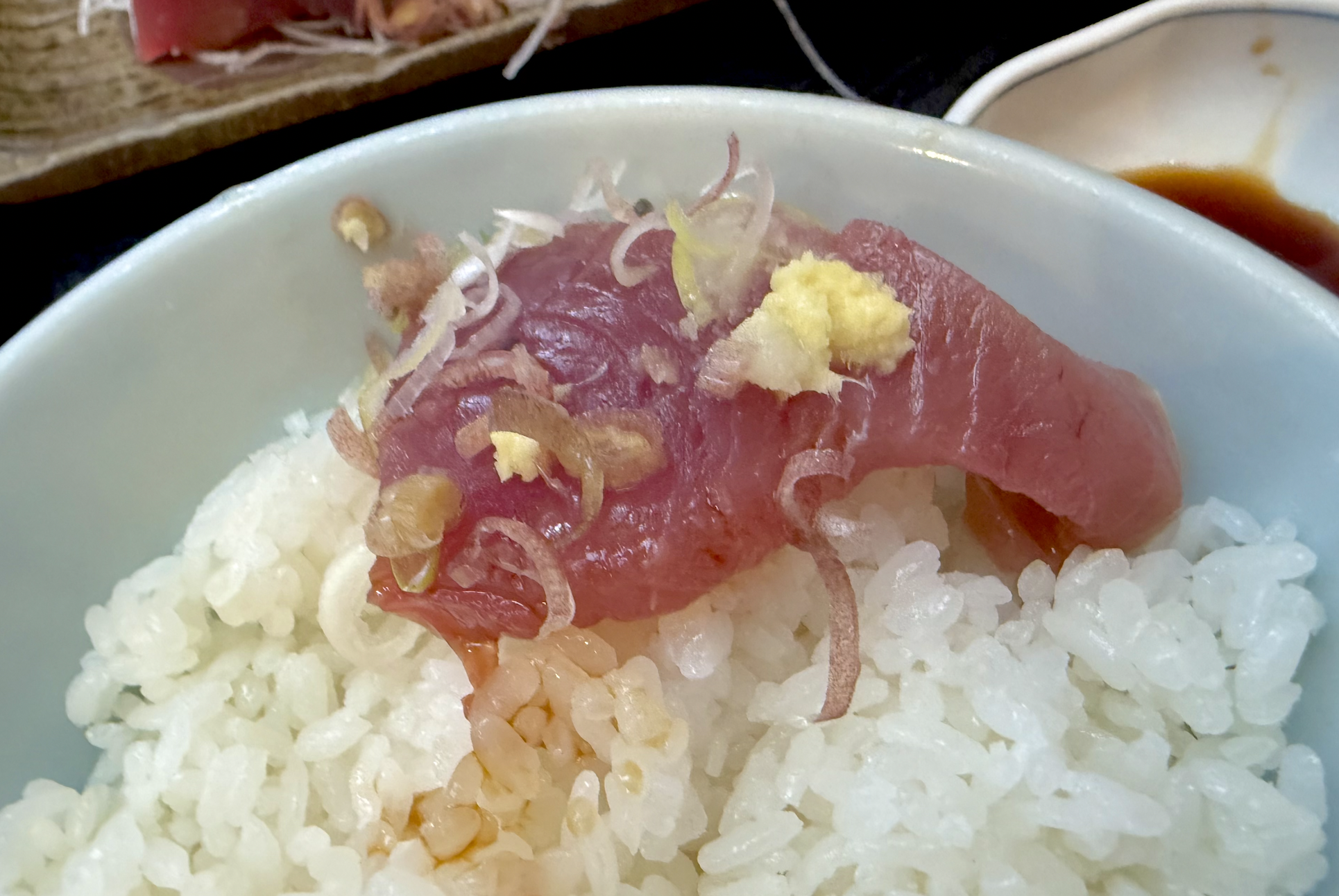 たっぷりのネギとミョウガにニンニクとショウガのWおろし。薬味があればあるほどうまいカツオ、特にミョウガが嬉しいね。