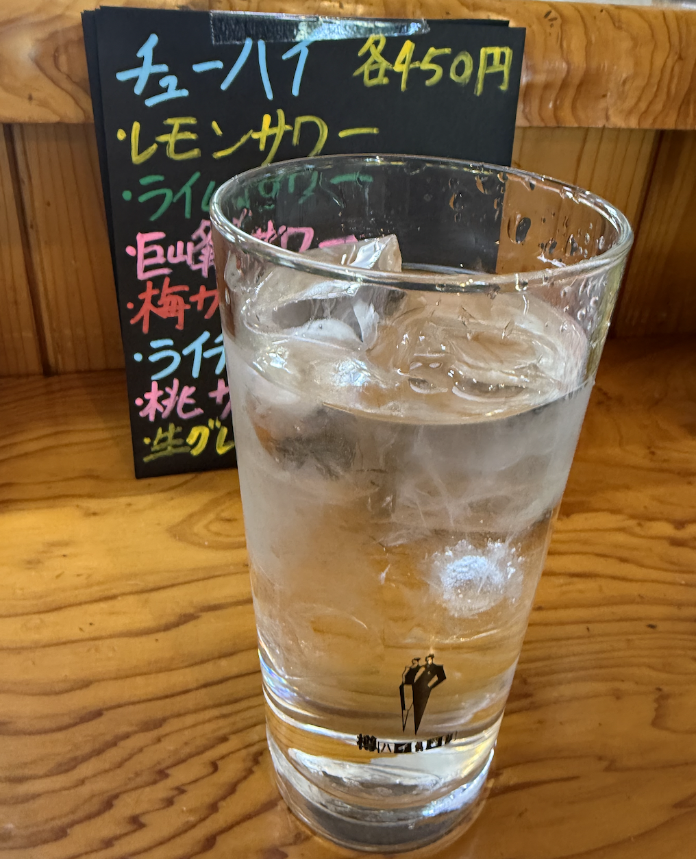 いつもは熱いお茶のところ、夏にはデカいお冷やを出してくれるありがたさ。怪しげなグラスで後ろにはサワーの文字も見えますが、断じてお冷やです。