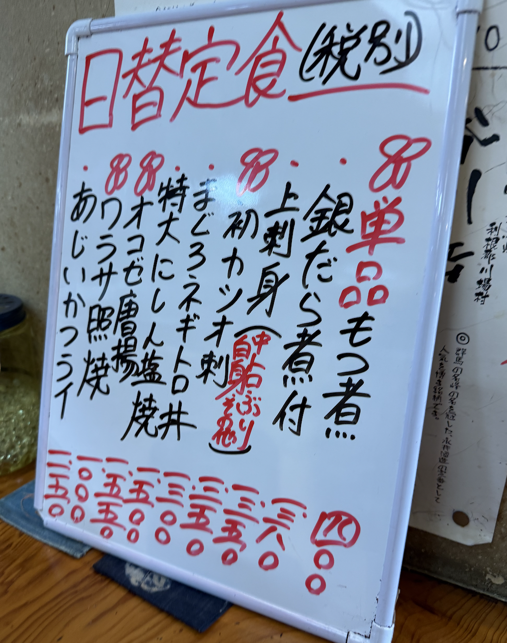 カウンター席の端っこに陣取り、日替定食ホワイトボードとにらめっこ。