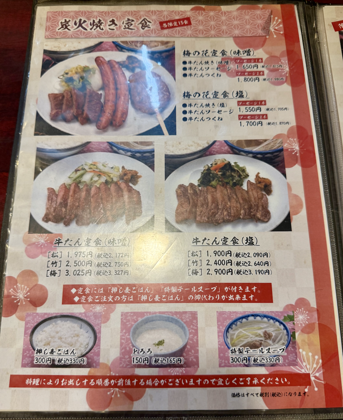 グランドメニューの炭火焼き定食、これか。牛たんソーセージやつくねもセットになる梅の花定食に、牛たん定食の味噌と塩。牛たん定食塩味の松かな‥いや、こちらは松竹梅の梅がエラいのか。では梅かな‥
