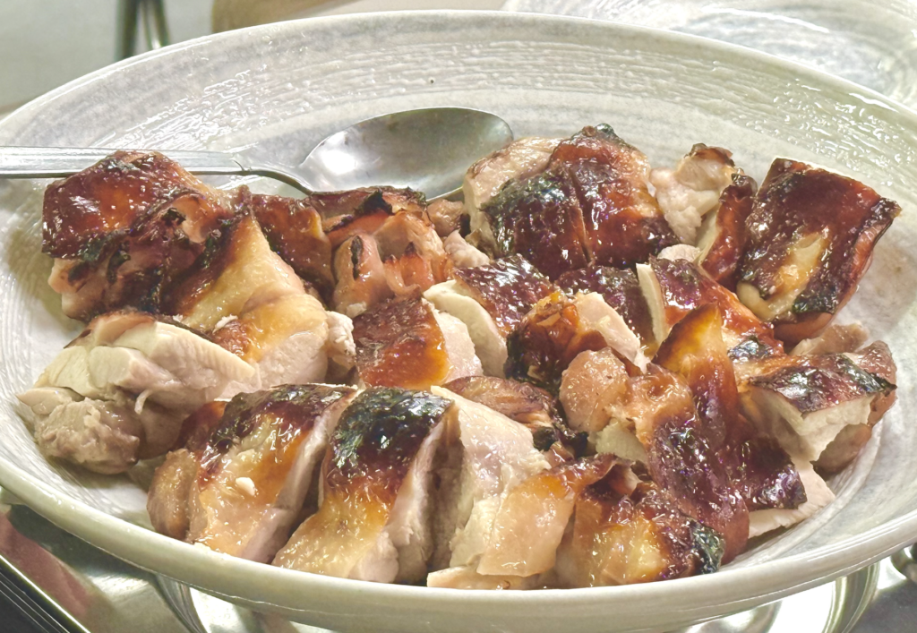 北京ダックの技法を使ったシン・パリパリチキン。恐るべき歯ごたえと香りを備えた皮、ジューシーなんてもんじゃない肉。