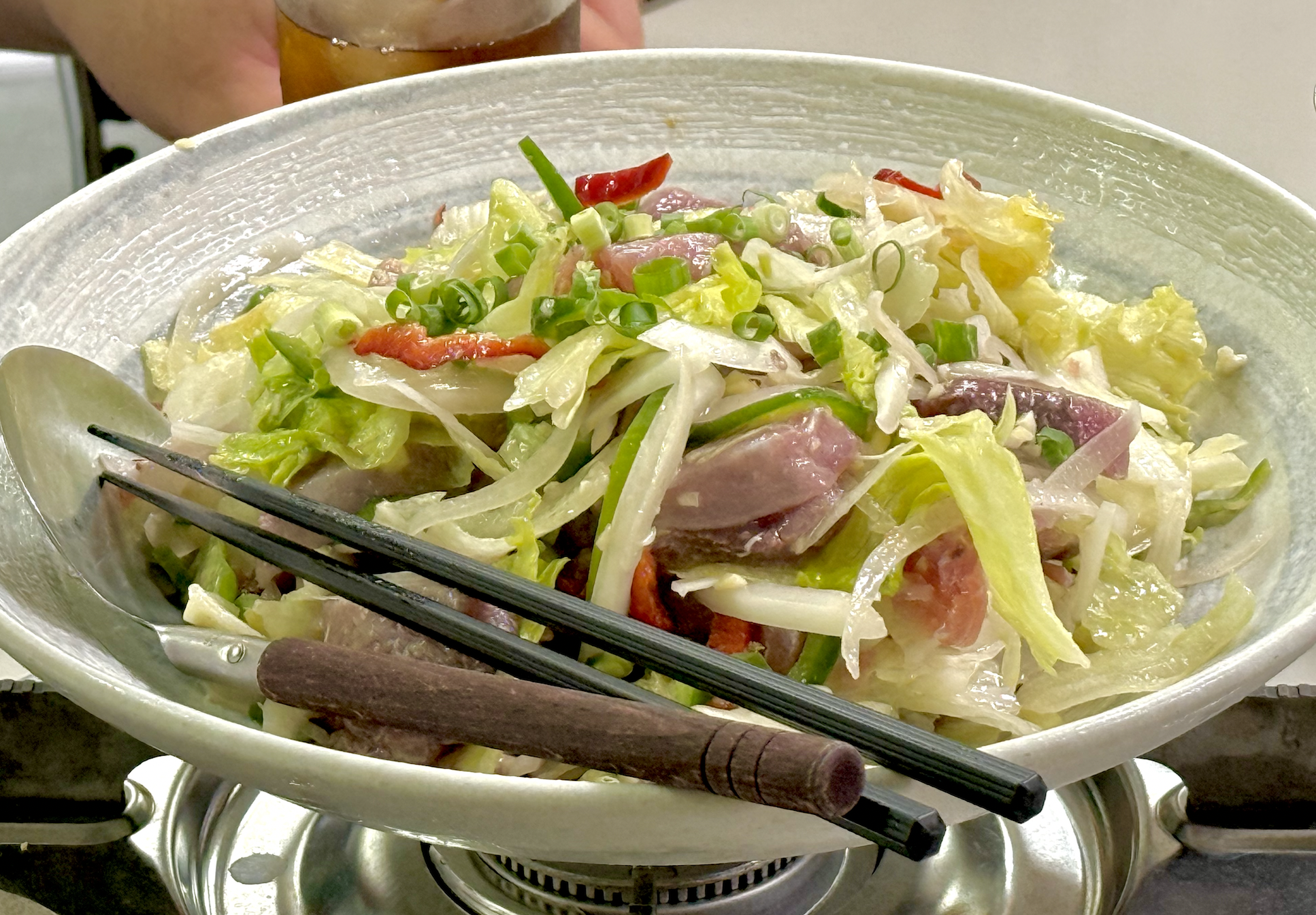まずはカツオの中華風サラダ。山ほどの薬味と野菜に包まれたカツオは美味しさが約束されています。