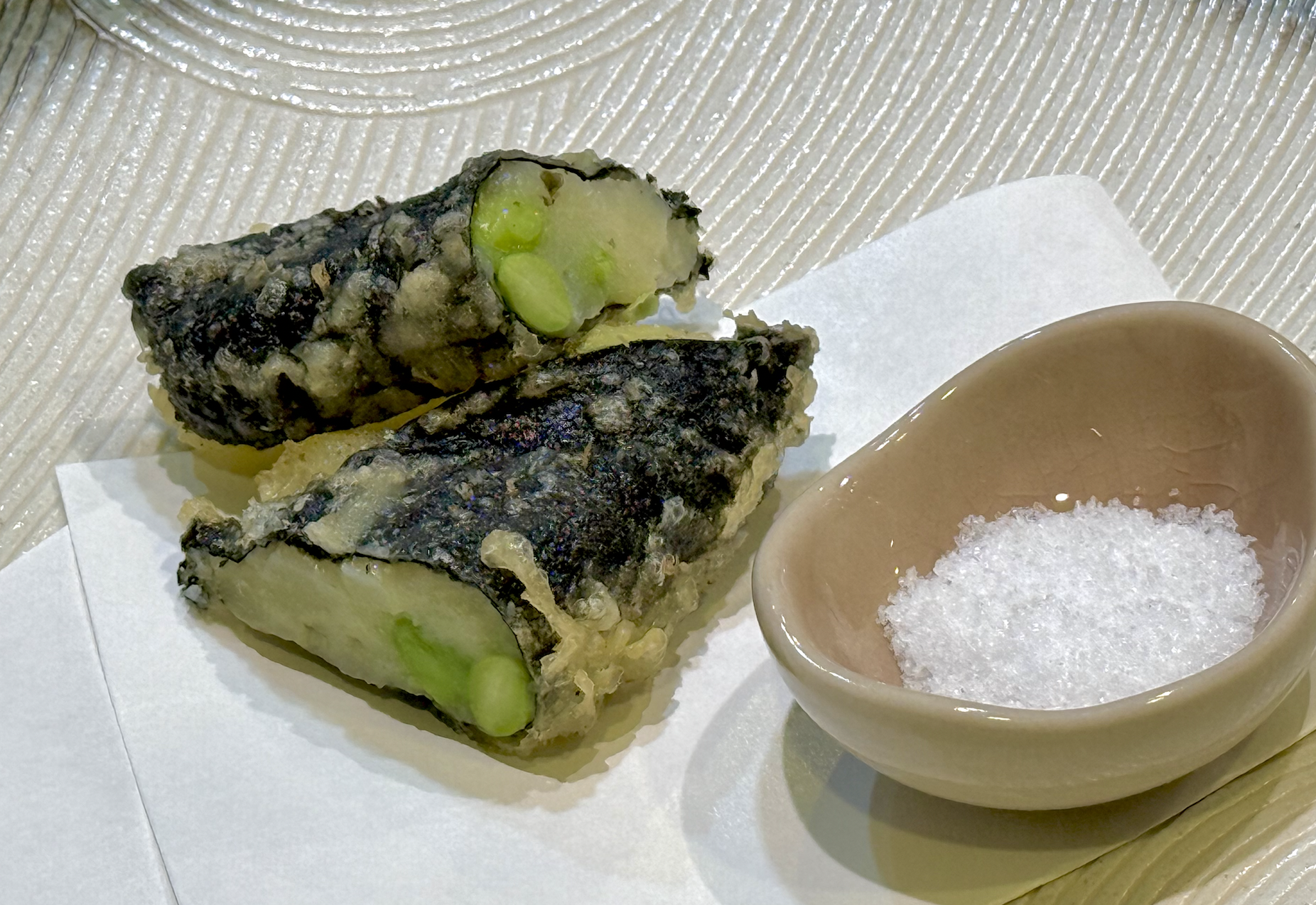エビと枝豆の天ぷらはマメが香る香る。すっきり爽やかリースリングをキューと飲み干してしまうじゃないの。