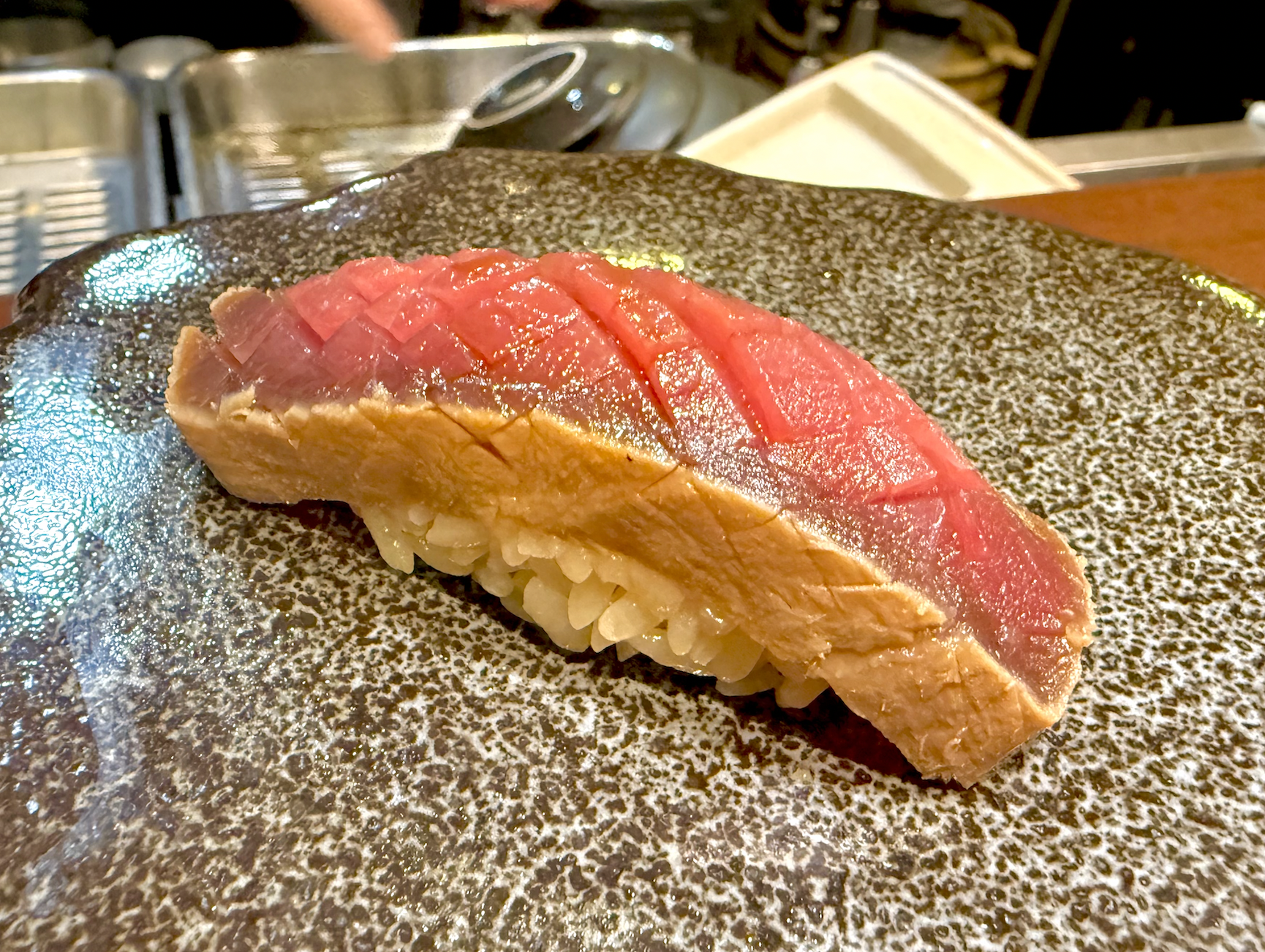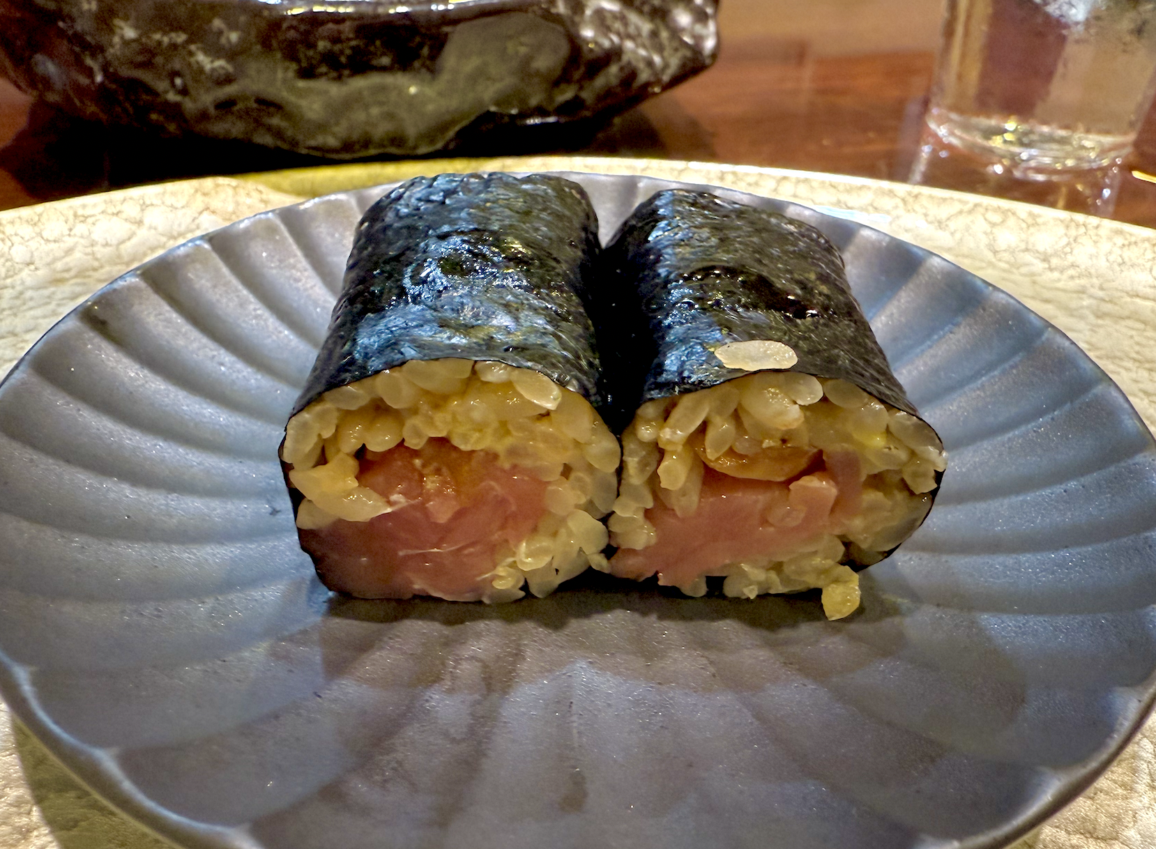 ひ乃さんのスペシャリテであろうトロ鉄火巻き 玉ねぎ醤油仕立て。トロたくの旨味特化みたいな感じで非常にうまい。6個くらいズラリと並べてくれてもいいんですよ?