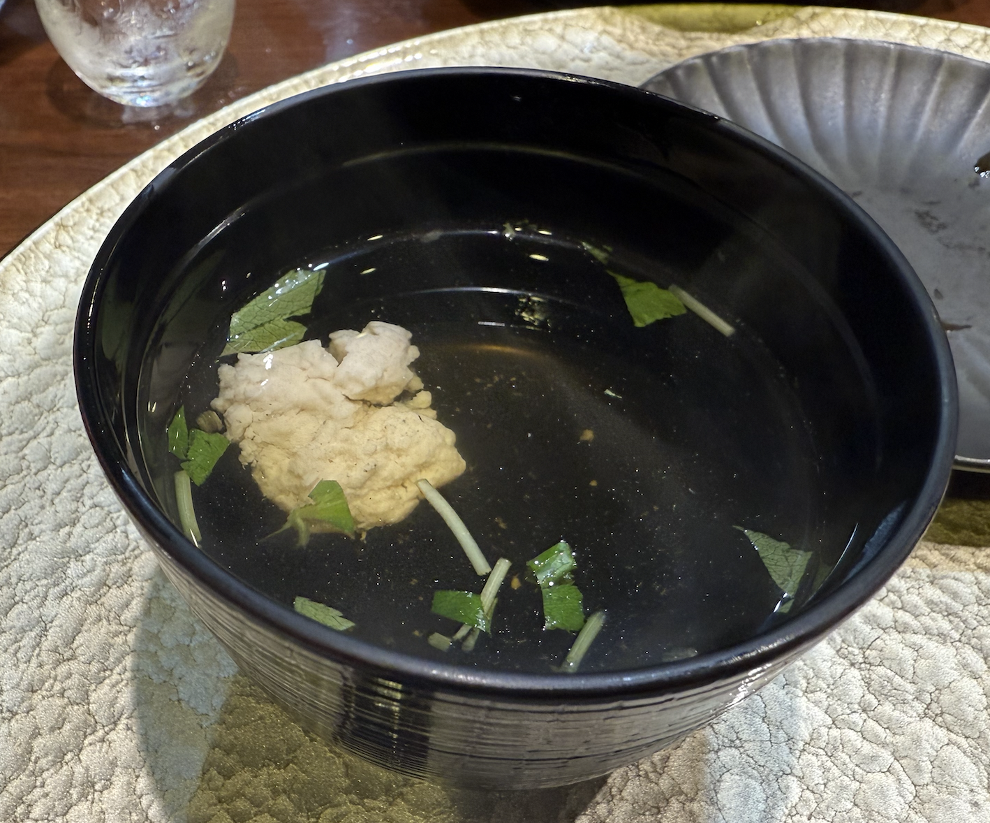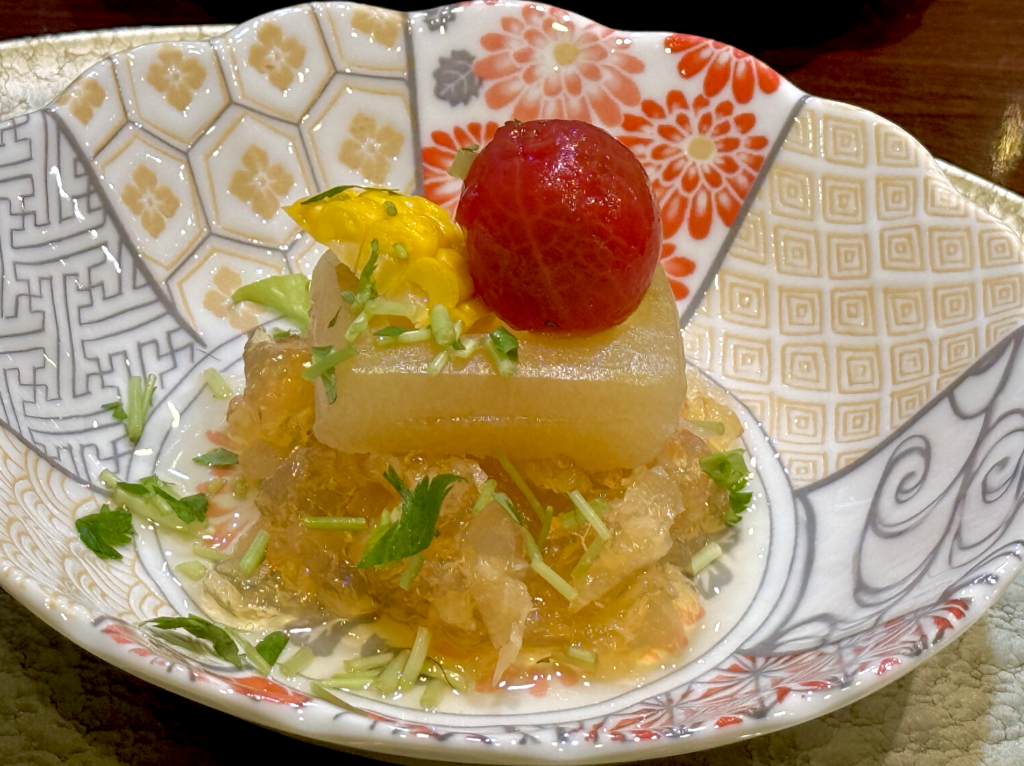 冬瓜の冷やし鉢からスタートです。夏です。ガリのジュレで味付けという、非常にお寿司屋さんらしい一品。