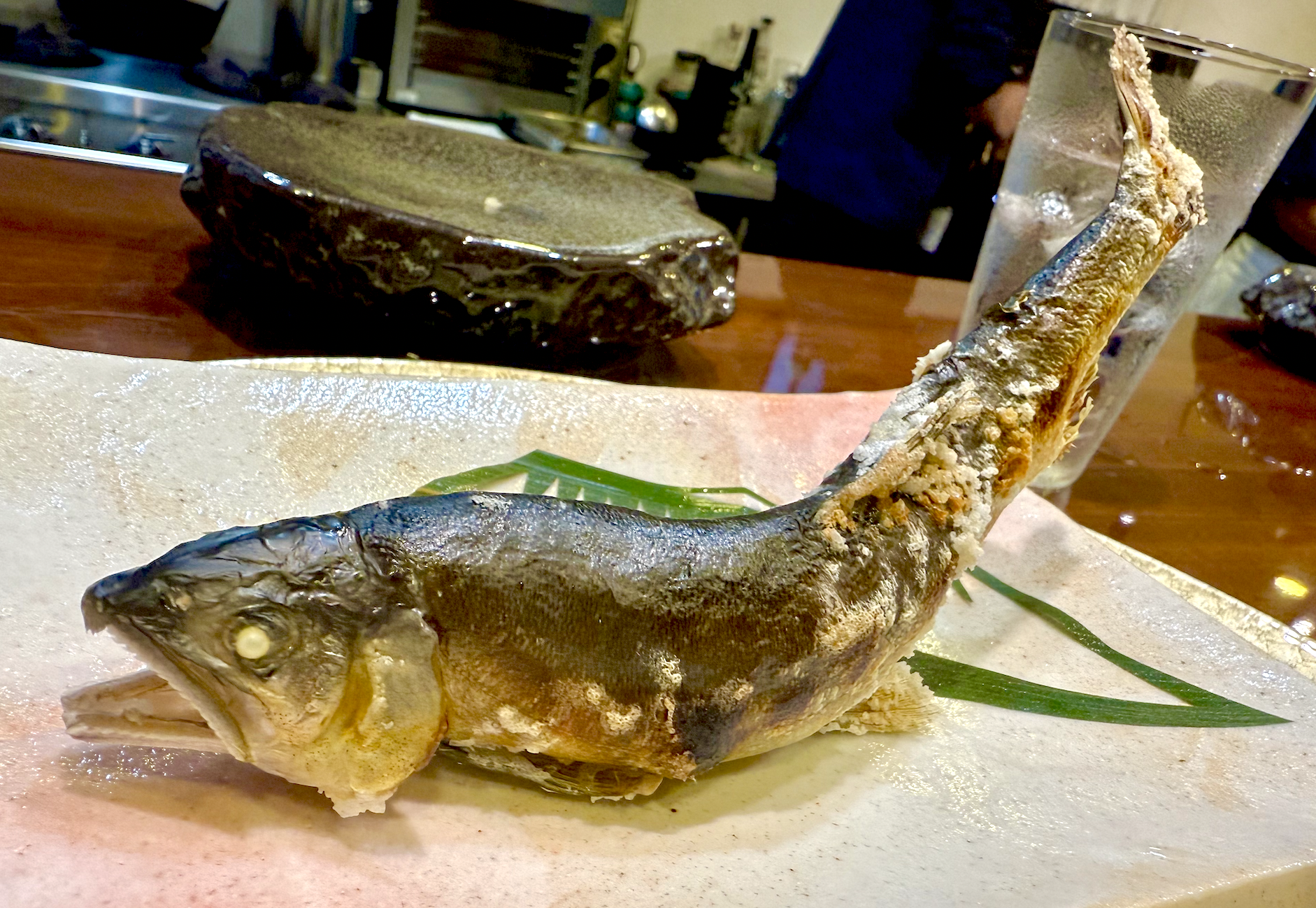 鮎の塩焼きだ〜。夏の大好物だ〜。嬉しい〜。デカかろうがなんだろうが、手づかみで頭からムシャリ。