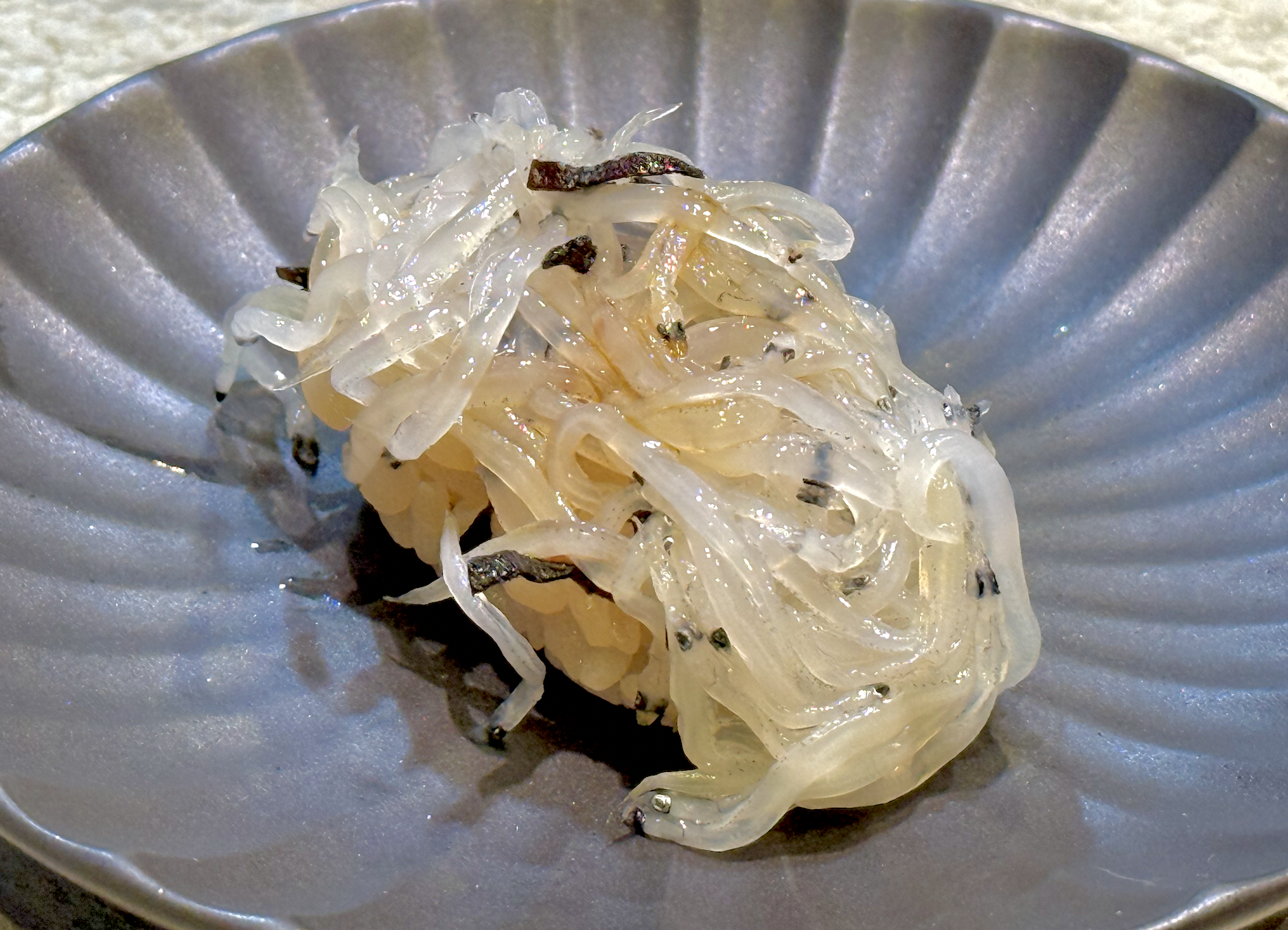 白魚昆布〆。食感ばかりで特別美味しいものではない気がする白魚、ところが昆布〆にすると旨味が大アップ、極上のツマミとなるじゃないか。