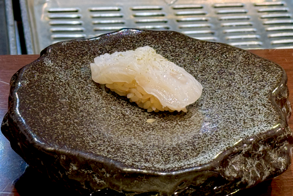 そして握りのスタート。初手、イカ‥に見えて、生だこです。吾有事のシュッとした吟醸香と白身の究極みたいなサッパリ味がぴったりじゃないか。