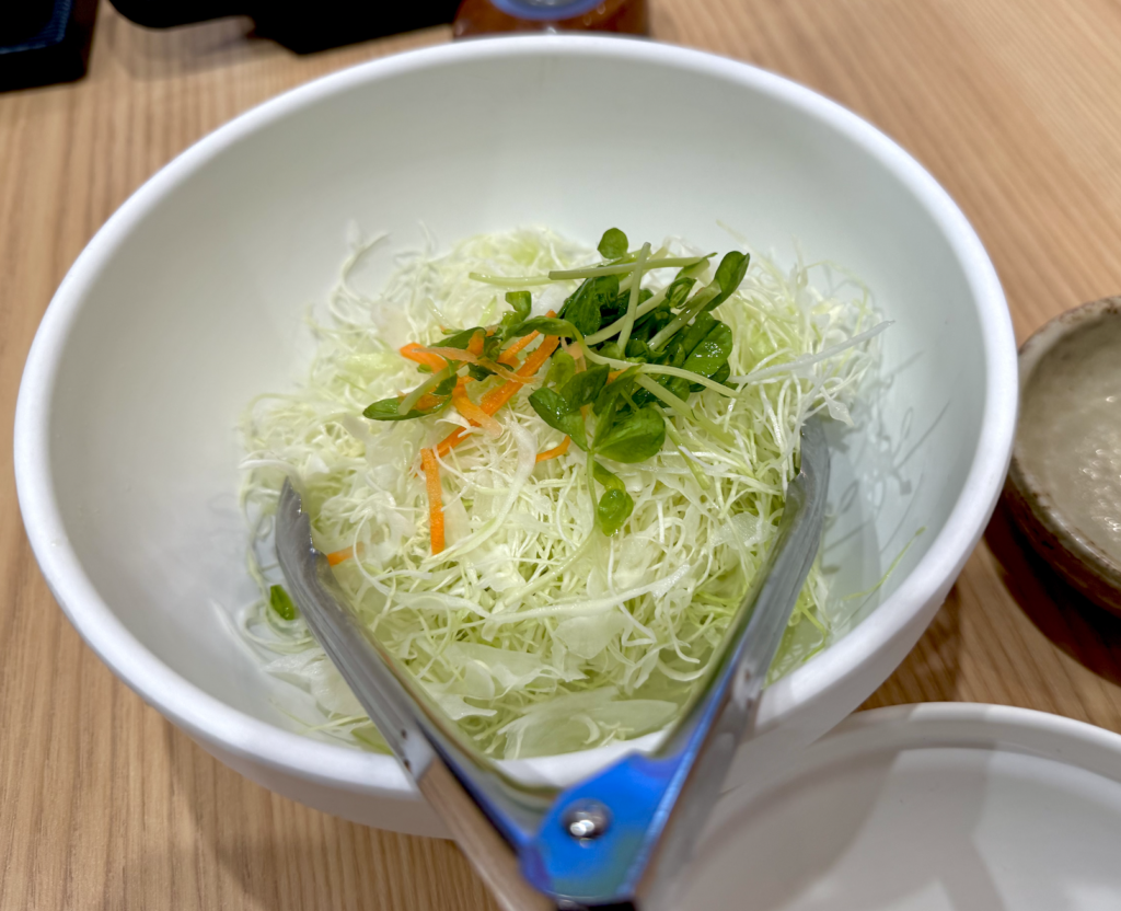 かつはな亭さんの好きポイント、最初からキャベツどっさり。おかわりもできるけど、あまり必要ないほどたくさんあるの。