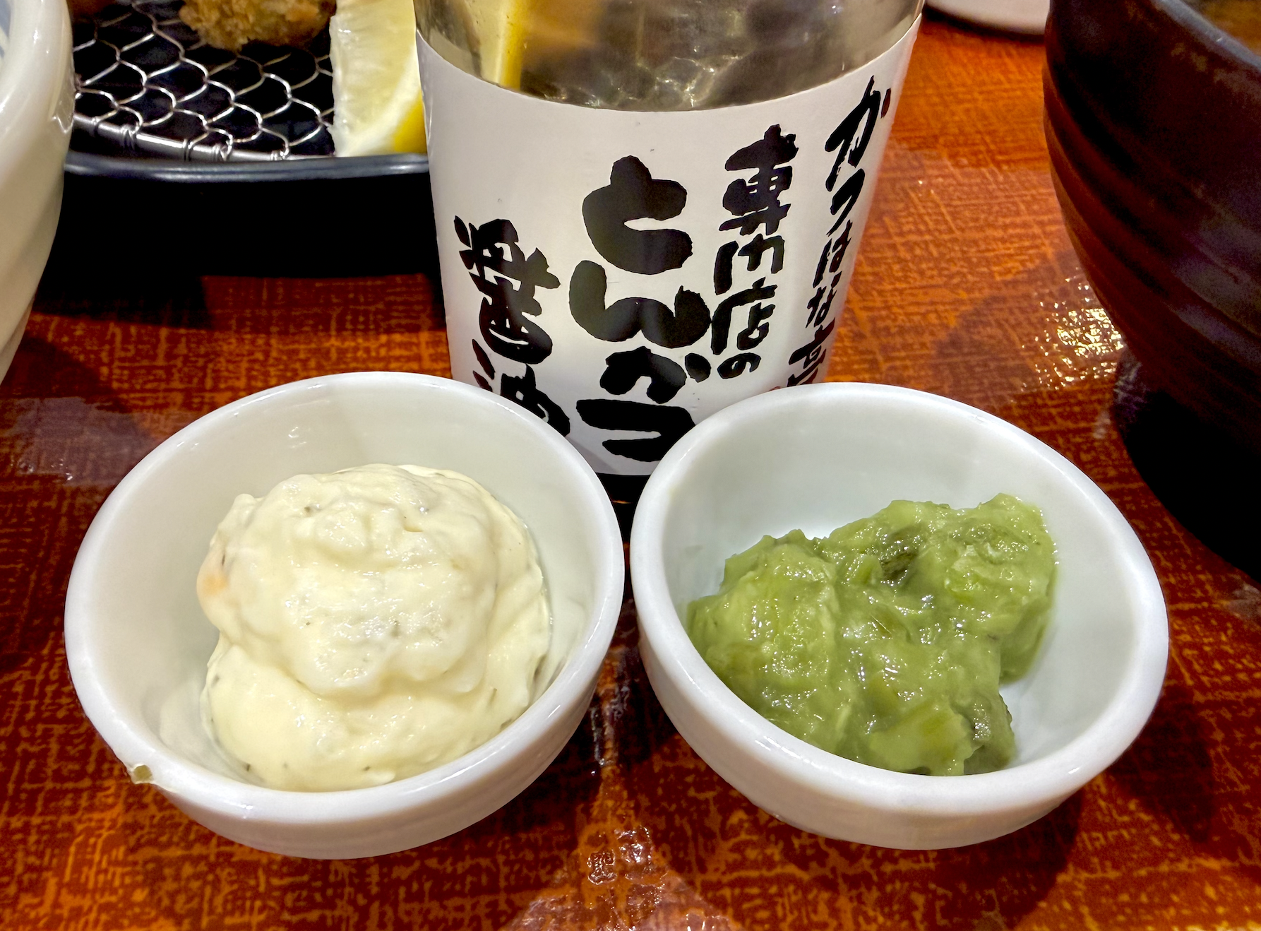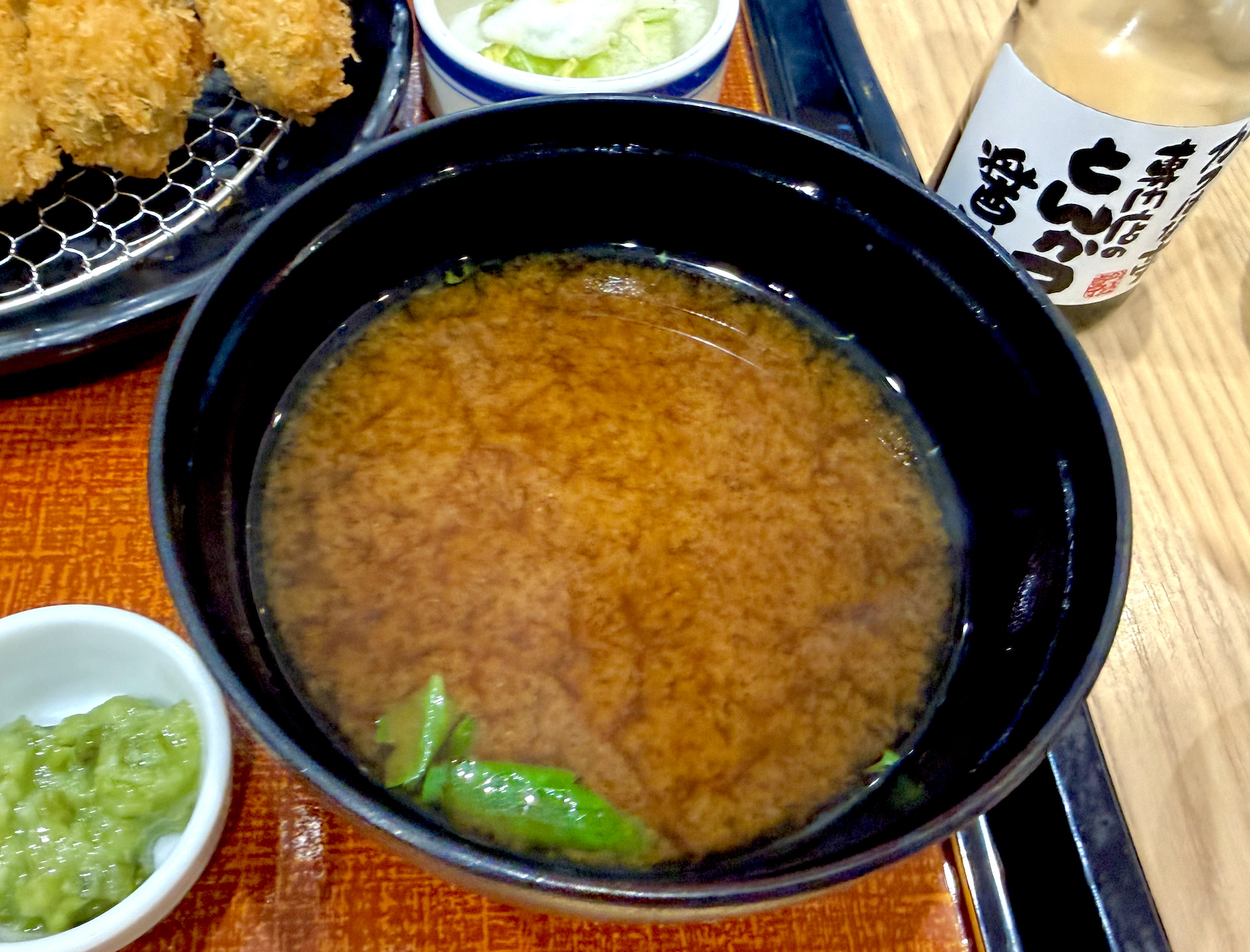 卓上にとんかつソースと塩、そして定食セットにはタルタル・刻みワサビ・とんかつ醤油。牡蠣の雪之丞変化が楽しめちゃうじゃないですか〜。お祭りだ〜。