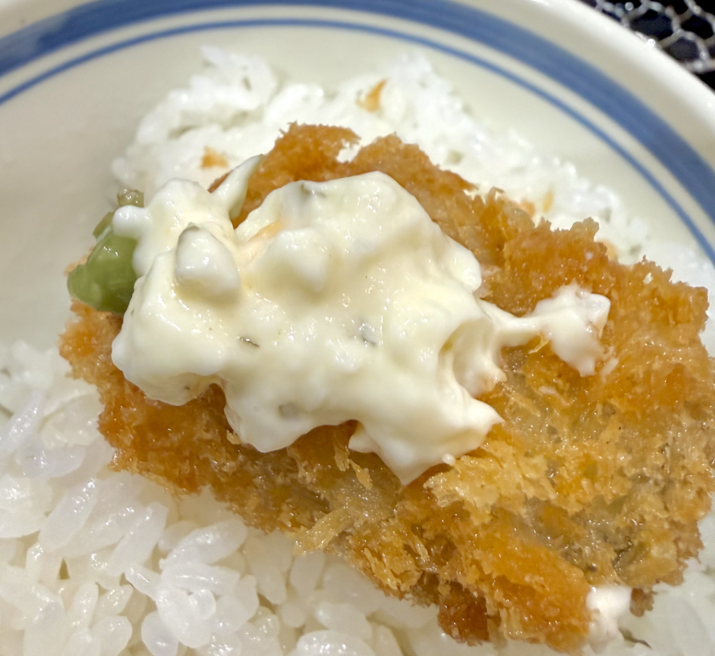 ラストスパートは王道のソースとたっぷりタルタルで、かきフライのっけご飯だ!