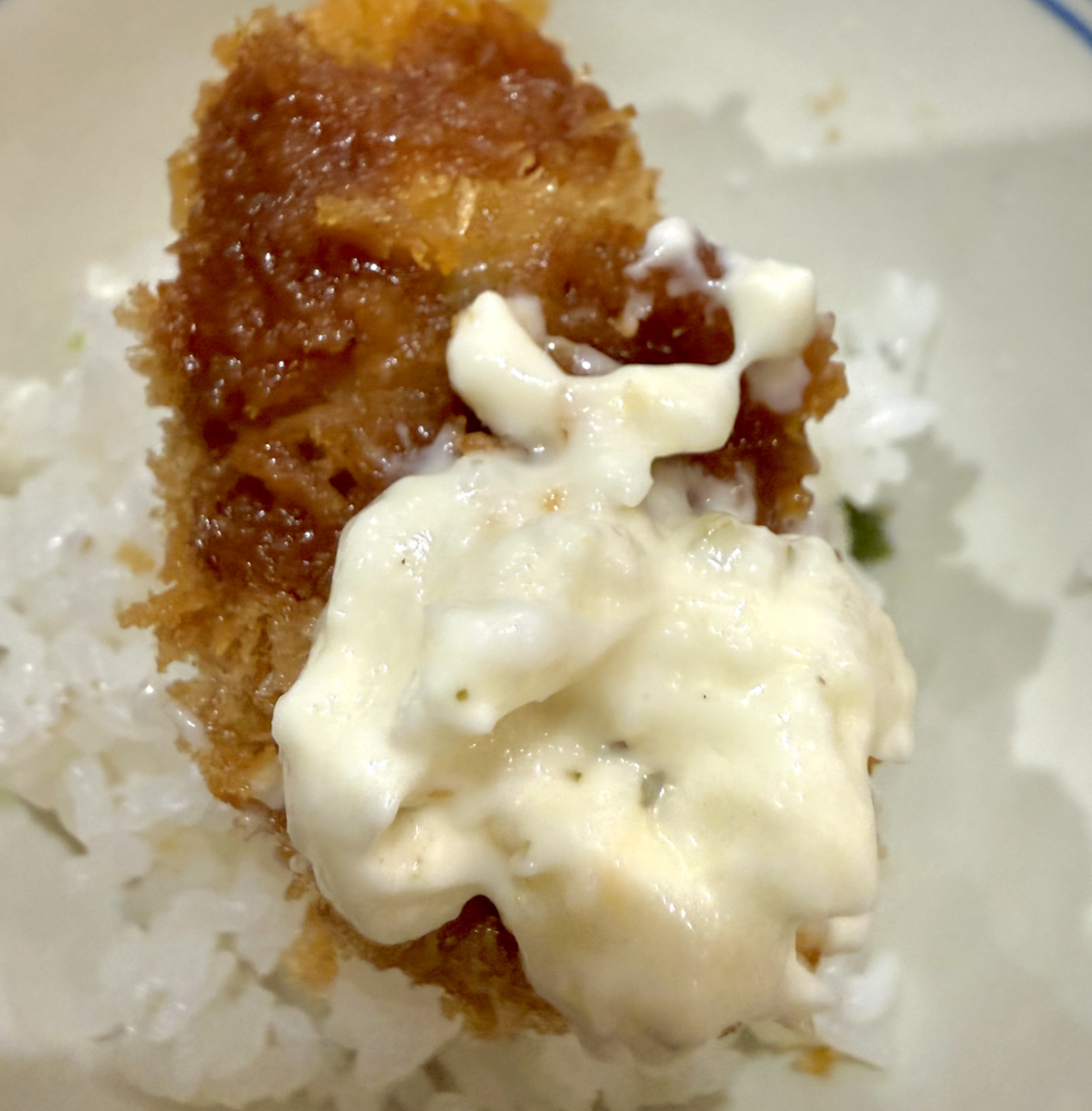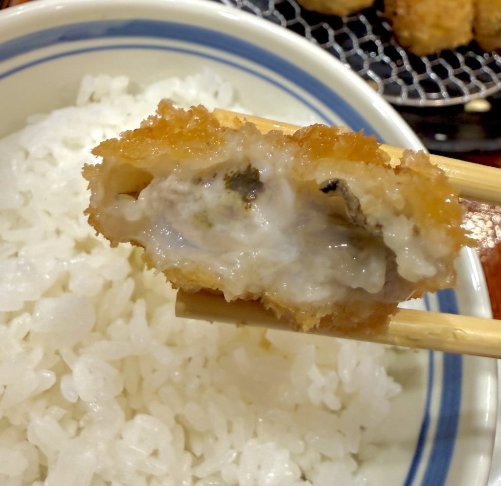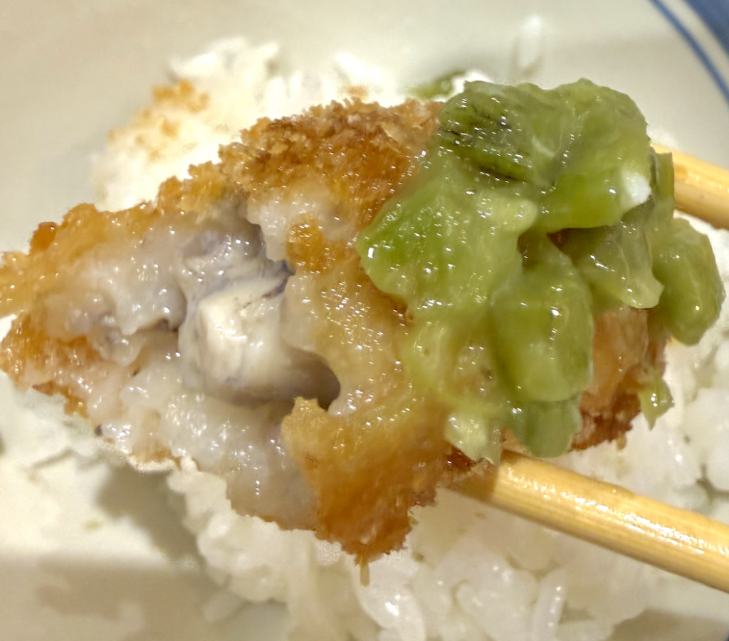 こいつはいつものかきフライとイメージが変わるね。牡蠣ジュースとワサビの組み合わせは白メシを呼んでたまらない。