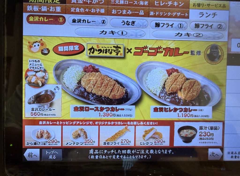 タブレットの「期間限定」をタップして‥うぉおい、金沢カレーまだあったの?8月いっぱいと書いてあった気がしたけど延長したのか!
