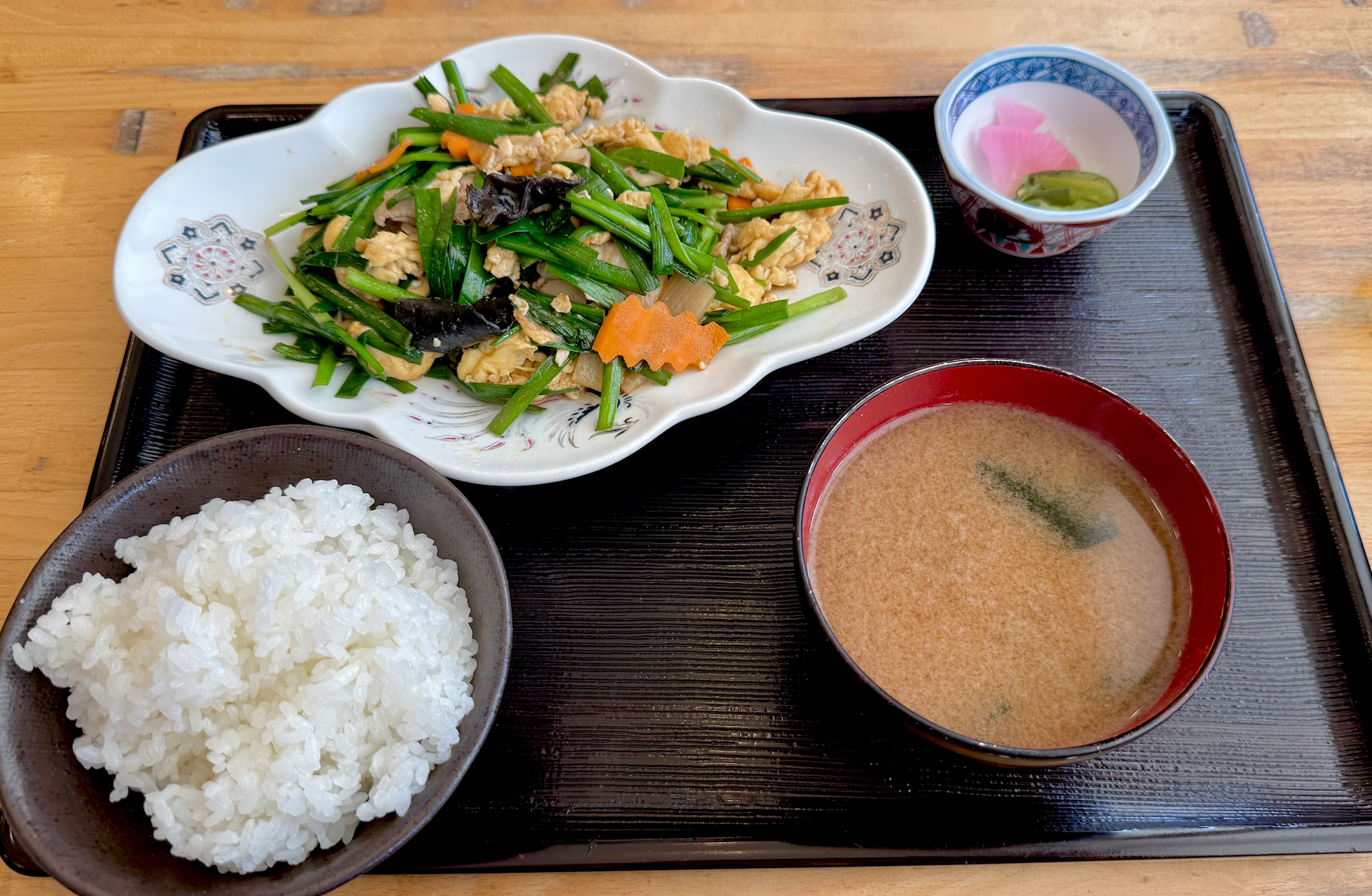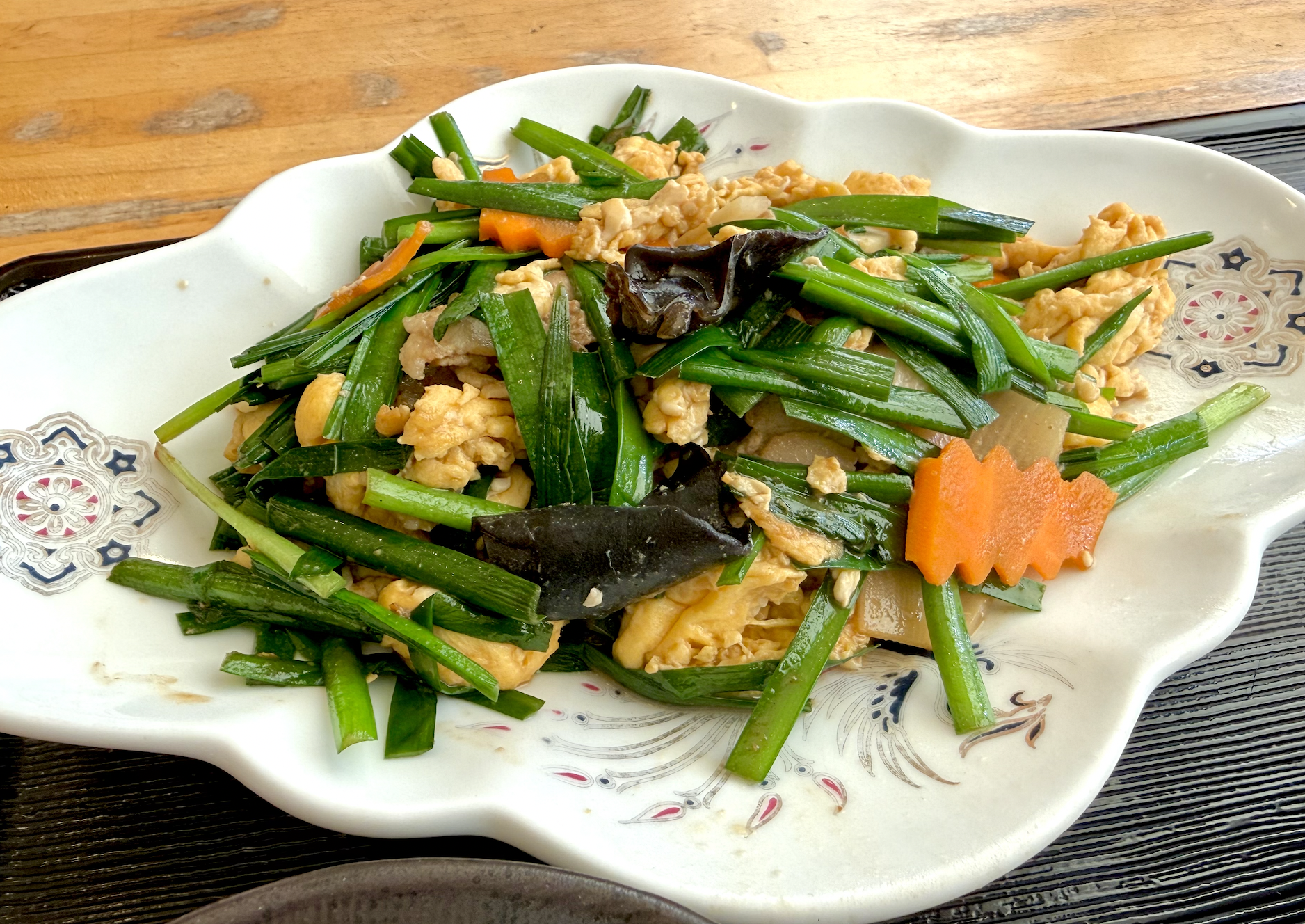 4,096色同時発色のような彩りに満ちたお皿。東楊亭さんと比べると、ニラ比率が高く青々としていますか。ニンジンの飾り切りとキクラゲが入るのは共通ですね。