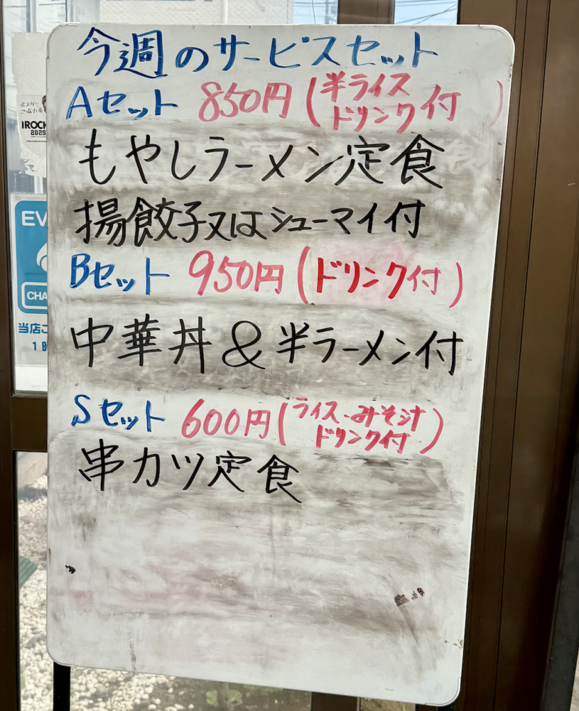 入口には週替わりサービスセットのホワイトボードが。中華丼&半ラーメンにドリンクがついて千円切りはありがたいな。
