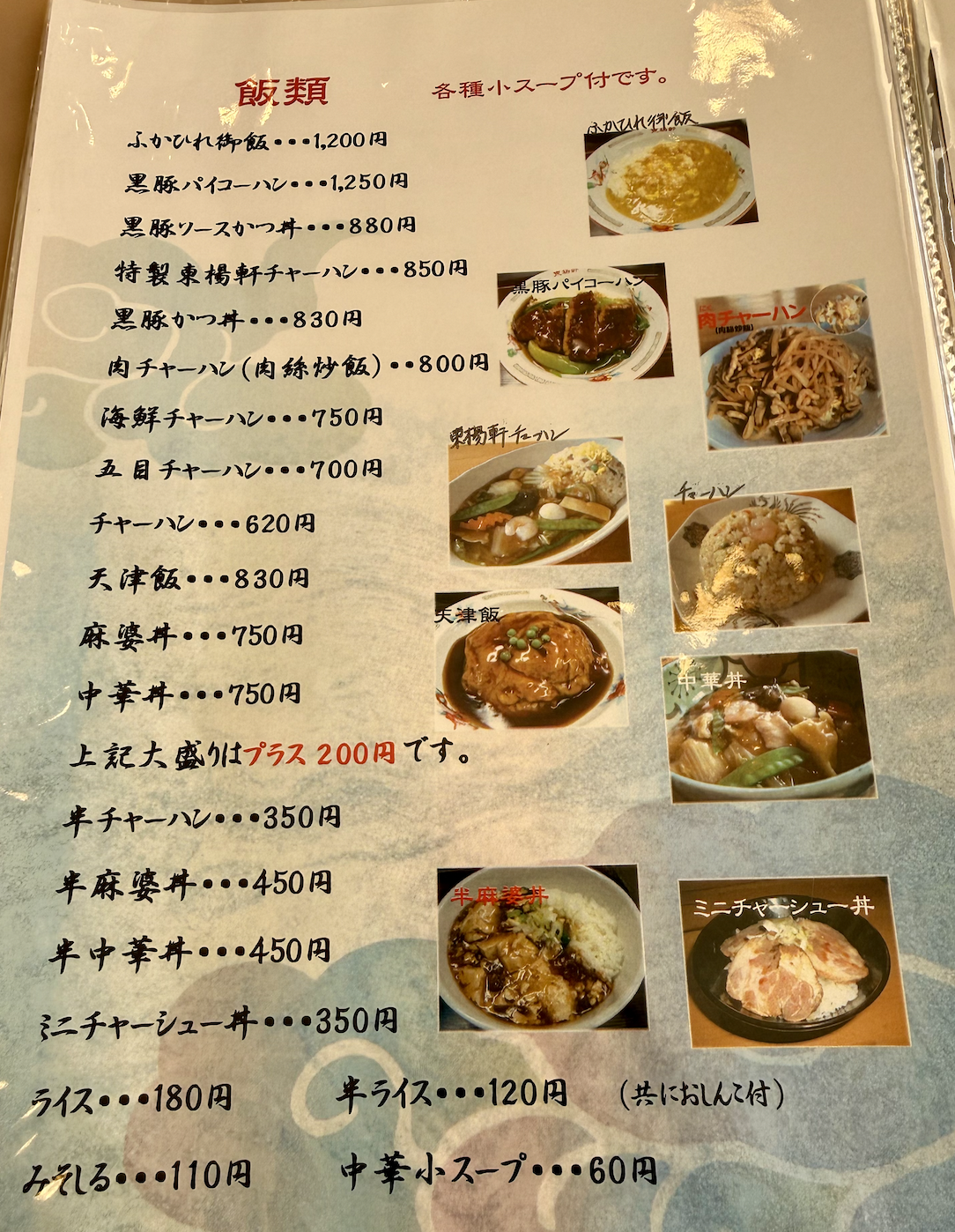 ご飯ものも多士済々。特製東楊軒チャーハンはあんかけなのかな?かたやきそばの「あん」がうまいのだから、チャーハンに五目のソレをかけちゃうのはチートであろう。