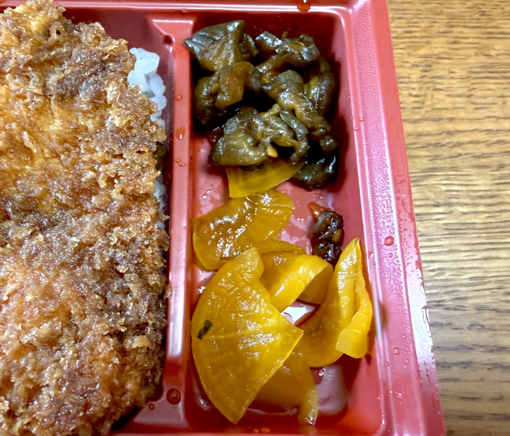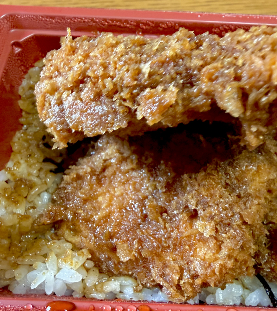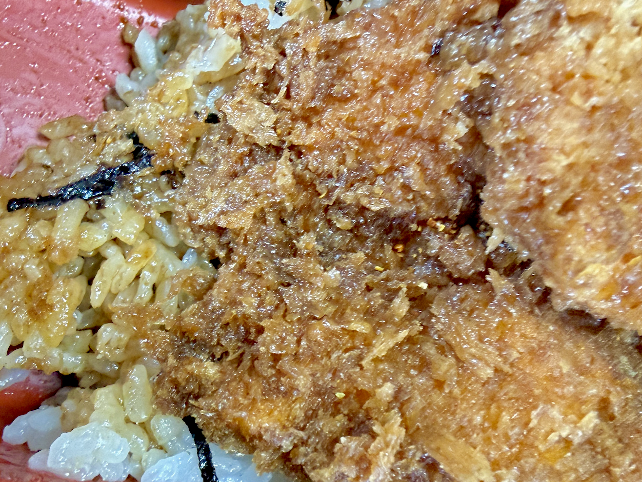 サラリと辛口のソースだれが絡まったチキンカツは、むっちりとした食べごたえ。衣のサクサク感こそなくなっていますが、その分味が染み染みで、恐ろしいまでにご飯の友。