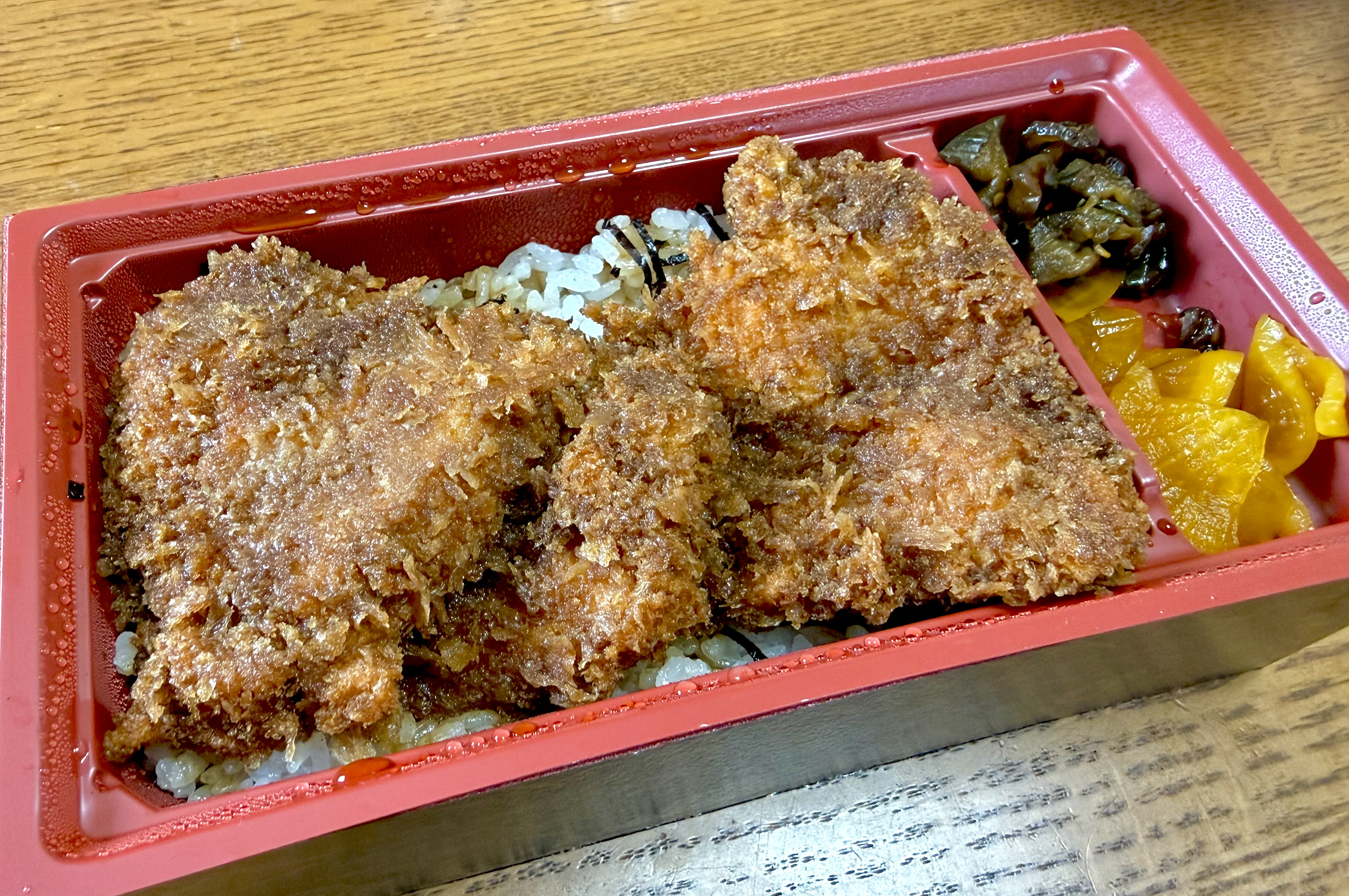 ニクをガブリとかじって、その真下のご飯を突き崩しての繰り返し。登利平さんの弁当は鳥めしでもソースカツ重でも、「うまいタレを絡めたニクでメシを喰らう」というシンプルさがたまらないのよ。単純明快に満腹一直線なのだ。