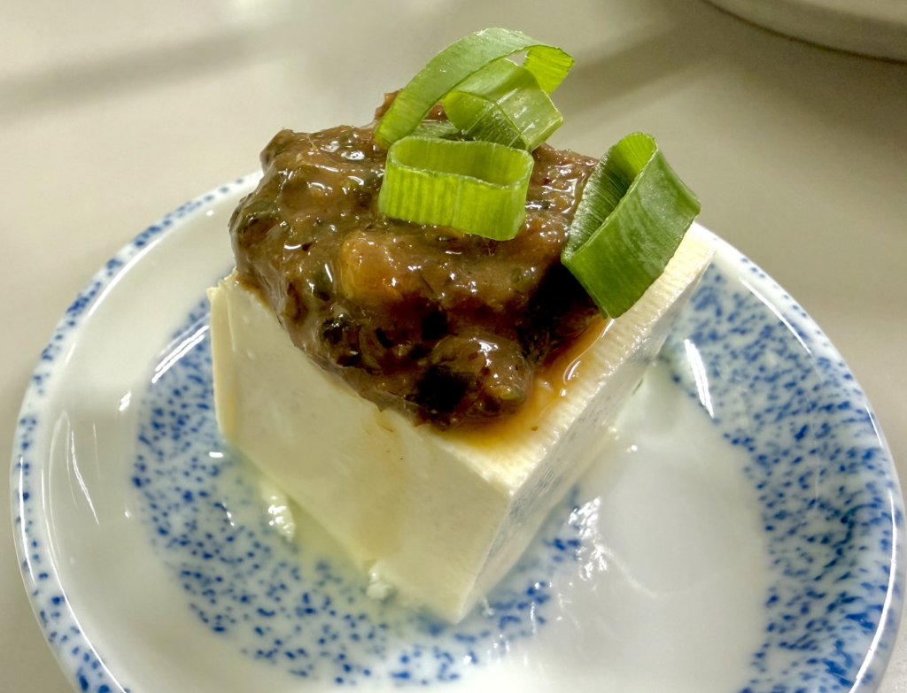 お次は冷奴ですが、ただのトウフではありません。上に乗るのはプロレス界伝統の味・湯豆腐鍋に使われる秘伝のタレ!