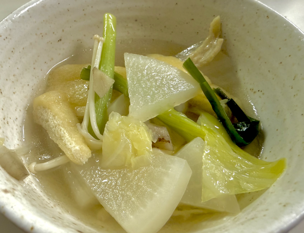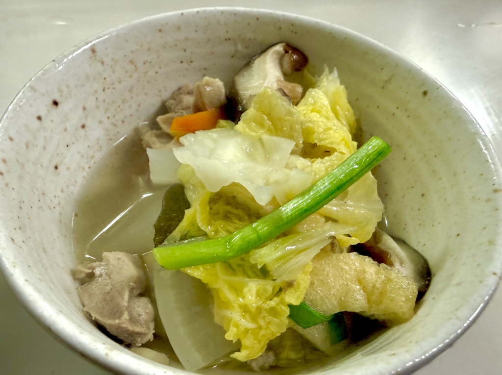 葉っぱやニラはシャッキリ食感が活きているし、大根ニンジンはしみじみうまい。シイタケや鶏肉はスープの旨さと相乗効果で‥たまるか!