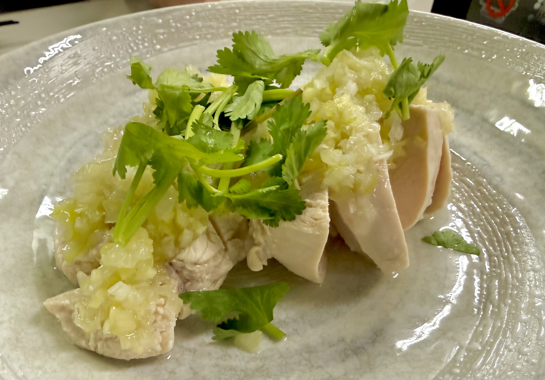 大好物の蒸し鶏ねぎソース。ねぎとパクチーをまとったしっとり鶏肉は、むね肉の常識を覆すうまさ。とんでもない白ワイン泥棒です。