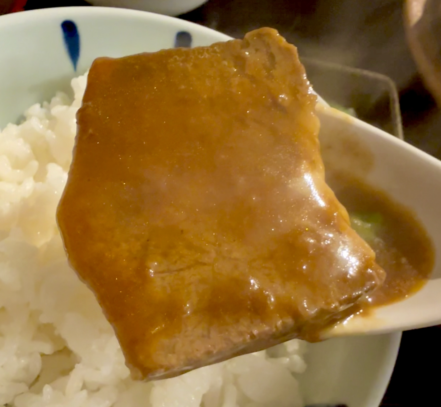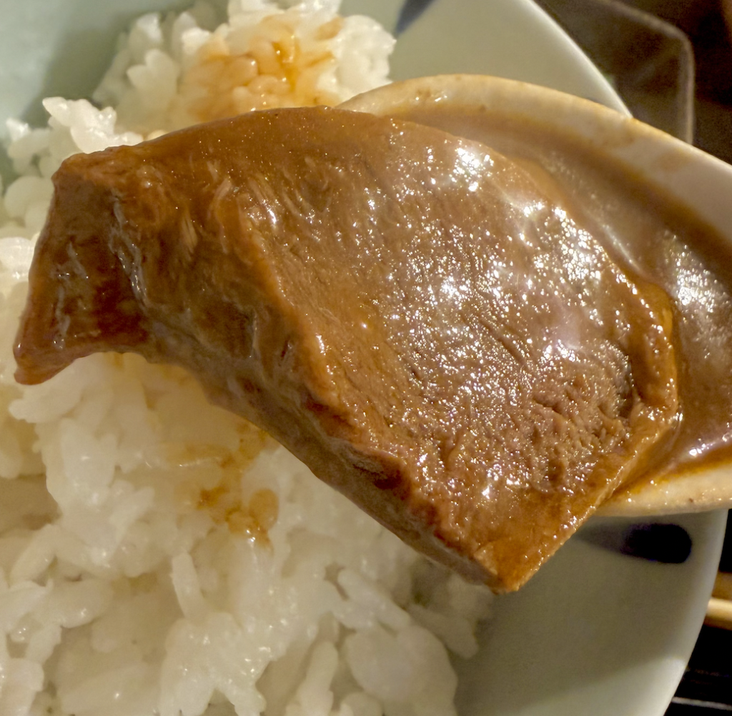 ホロホロとほどけ、寿司の大トロみたいにご飯と一体化してしまうようだ。脂身であろう部分のトロリとした食感もたまりませんな。