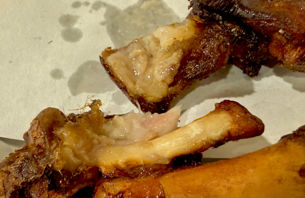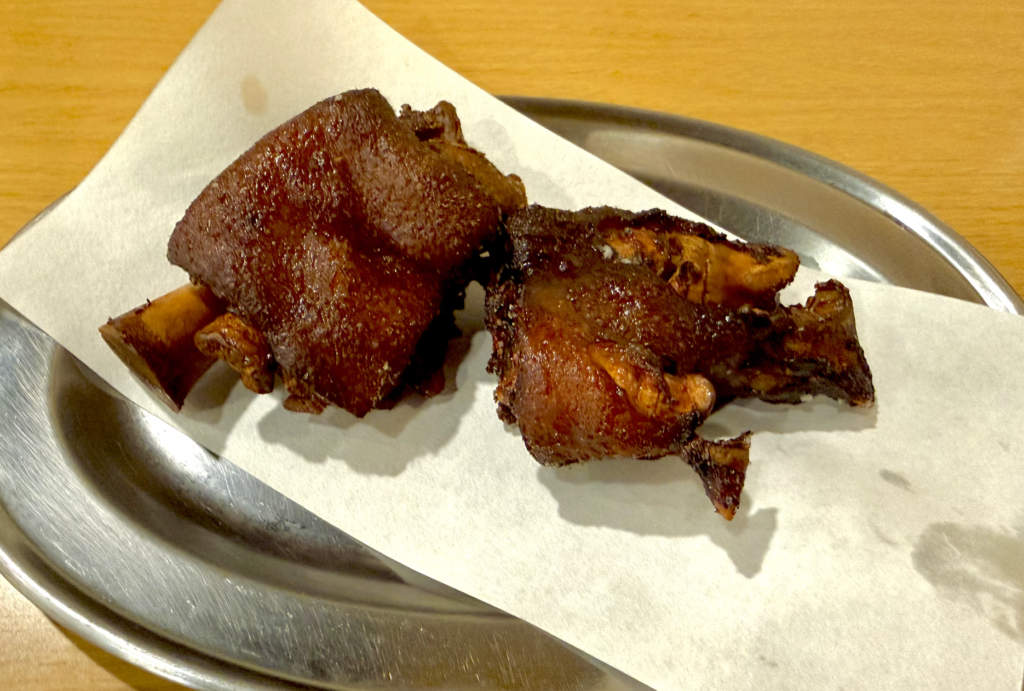 揚げ豚足来た〜!揚げたて熱々、そしてものすごい豚足独特のあの香りが!苦手な人は手も出せないだろうけど、ぼくは好きなんだなあ。
