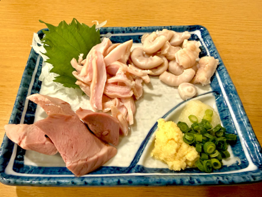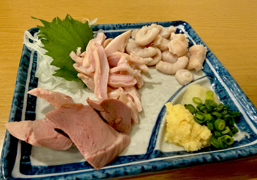 肉刺し盛り合わせがスゲー量で来ましたよ。右よりコブクロ・ガツ・ハツ。