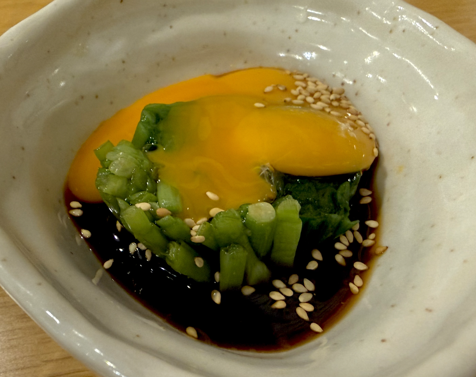 ニラと卵黄のおひたしは卵黄が崩れてしまった。でも味はすごくうまい!ニラとピッタリの甘辛ダレがいいねえ。