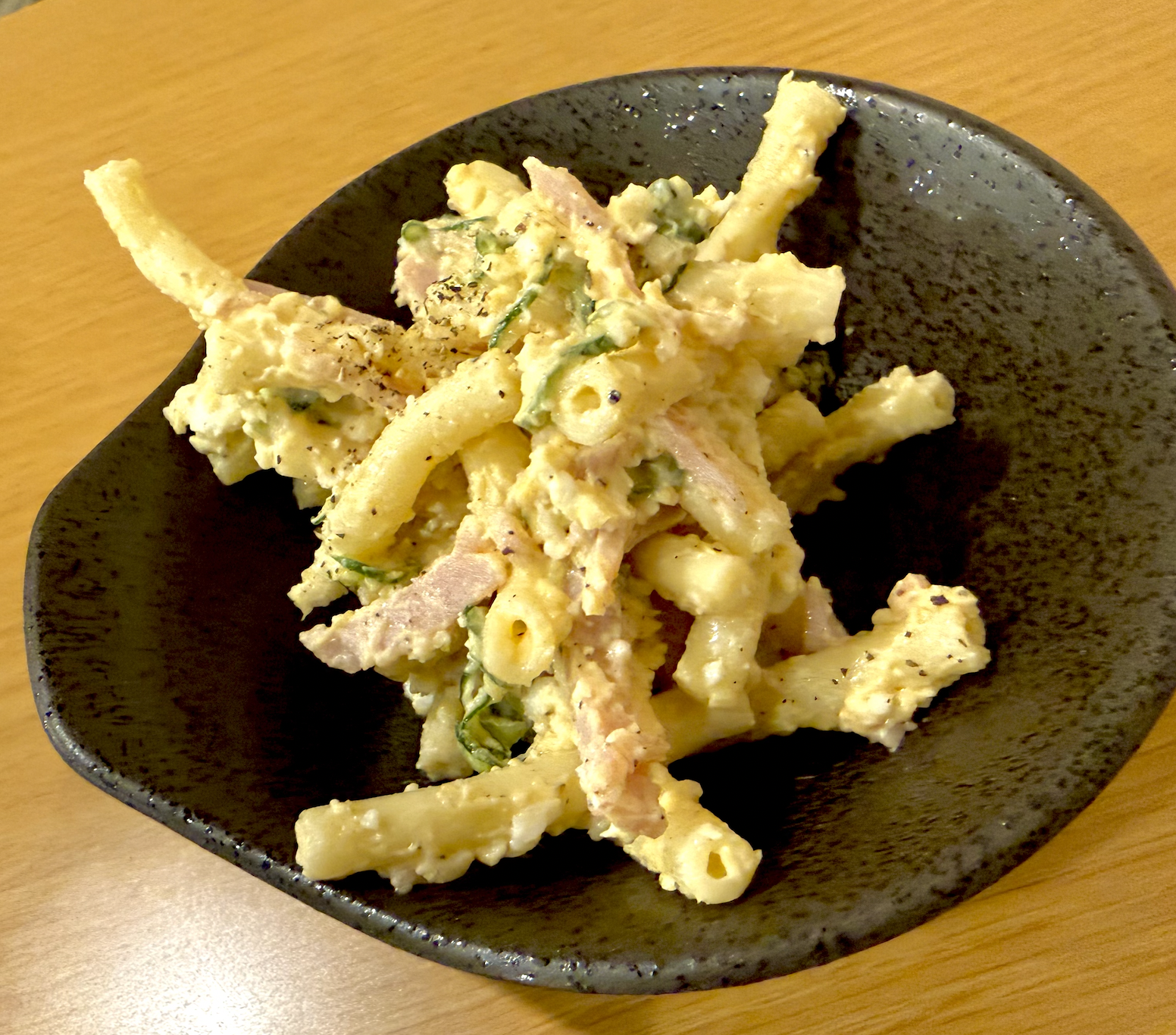 マカロニサラダはマヨ控えめでコショウが香るアダルトタッチなお味。いいねえ、なんだかハイボールが飲みたくなる。ブラックニッカとか高くないヤツ。