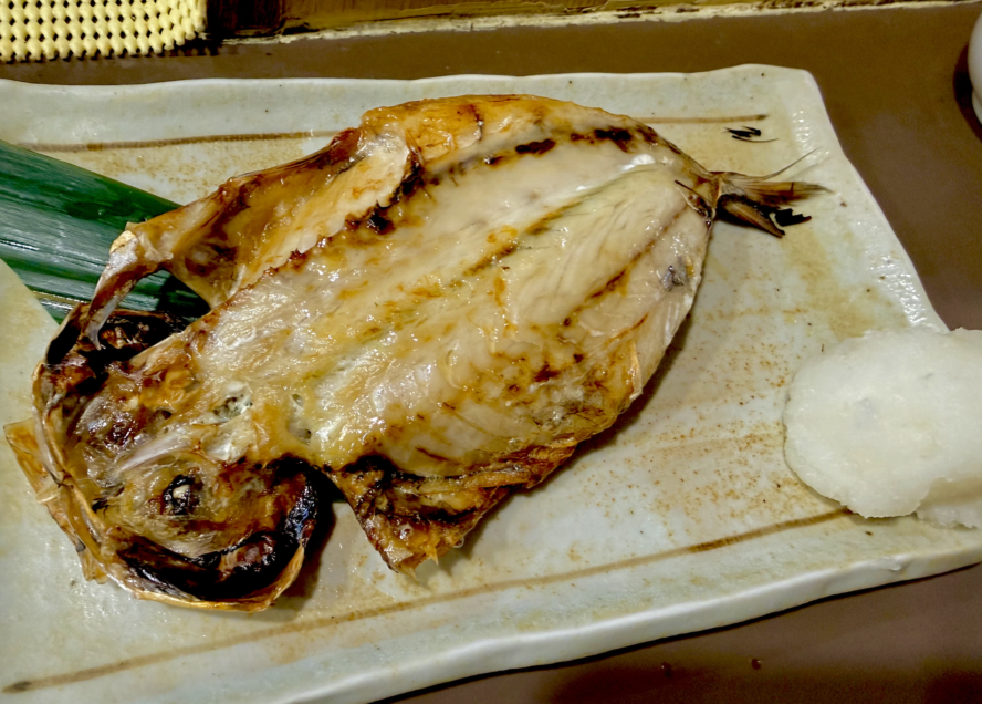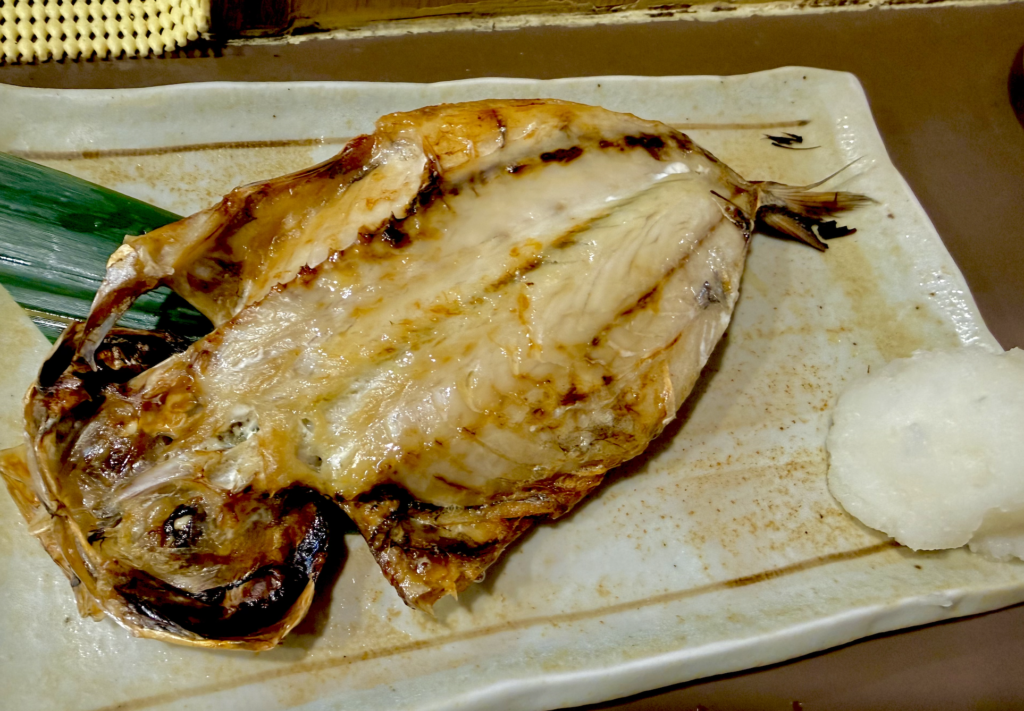 これがまた当然のように逸品!伊豆とか長崎とか、国産とれとれアジの天日干しでしょうか。やや小ぶりながらも脂のり良好、そしてなんとも香り高い。うまくてうまくて、皮どころか目玉まで掘って食べちゃう。