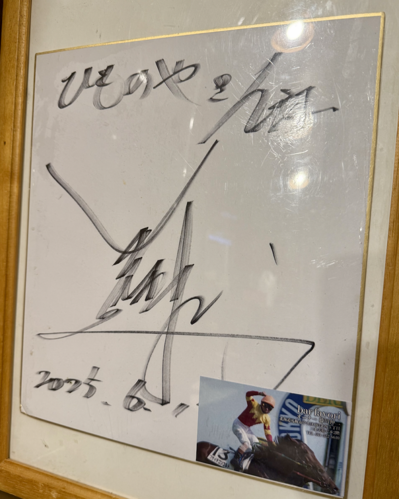 あっ、藤田伸二元ジョッキーのサインだ!名刺の写真はトランセンドじゃなくてフサイチコンコルドなんだね。やっぱりダービーは特別なんだな。