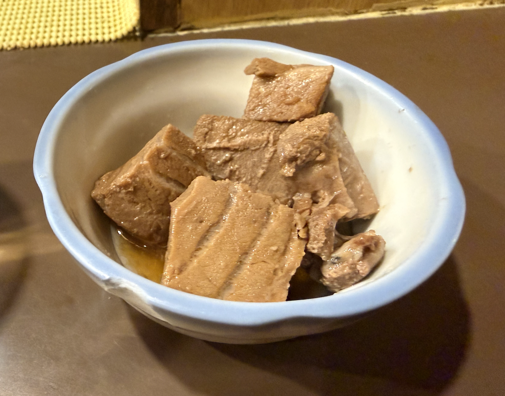 お通しはマグロを煮たものですが、完全にフレーク化はせず、しっとり感を保っている。脂の旨味まで感じてすこぶるうまいじゃないか。もしかして本マグロなのでは?
