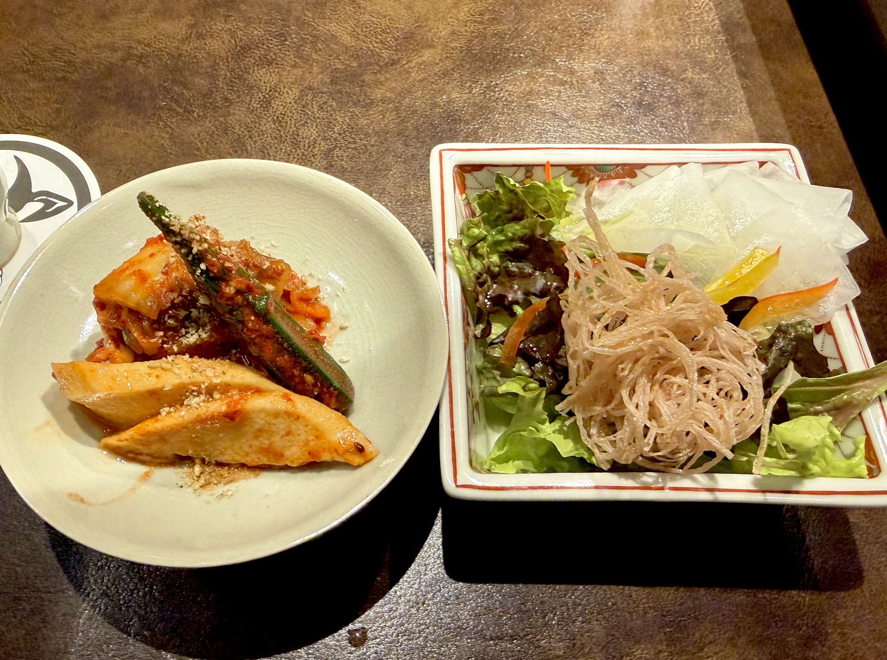 白菜・オクラ・長芋のキムチ大根とスルメ(!)のサラダ