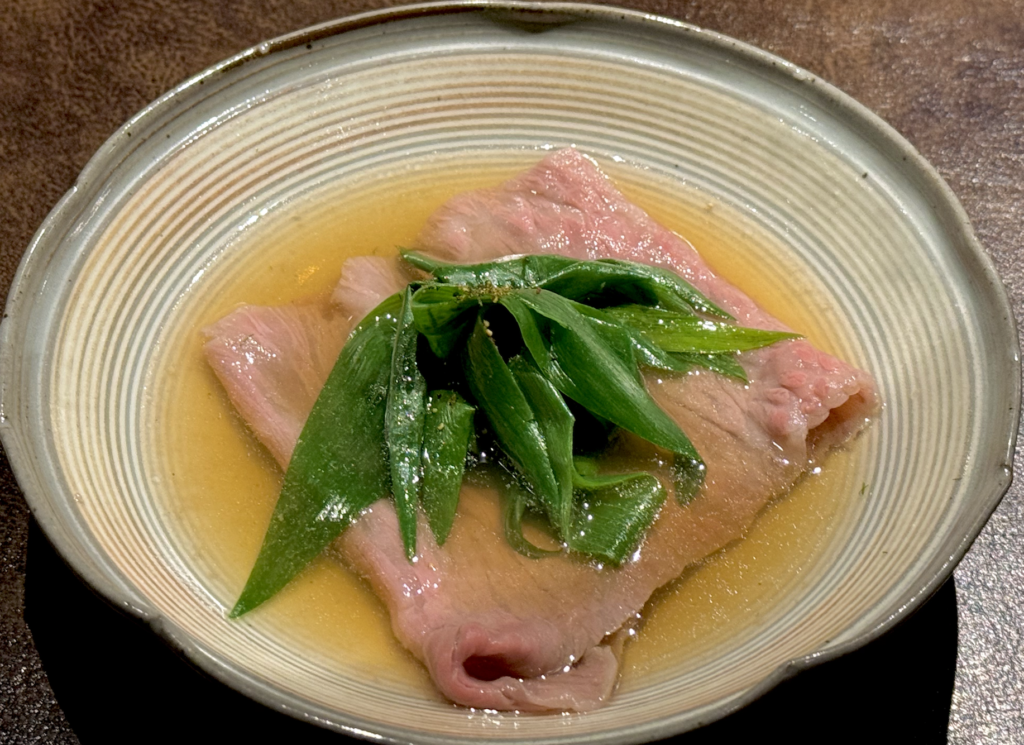 美しいピンクに仕上がったサーロインと、高級和食店の系譜らしい極上出汁。オマケに香り高く柔らかい歯ざわりの九条ネギまでついてしまっては、文句なしに日本酒が進みます。