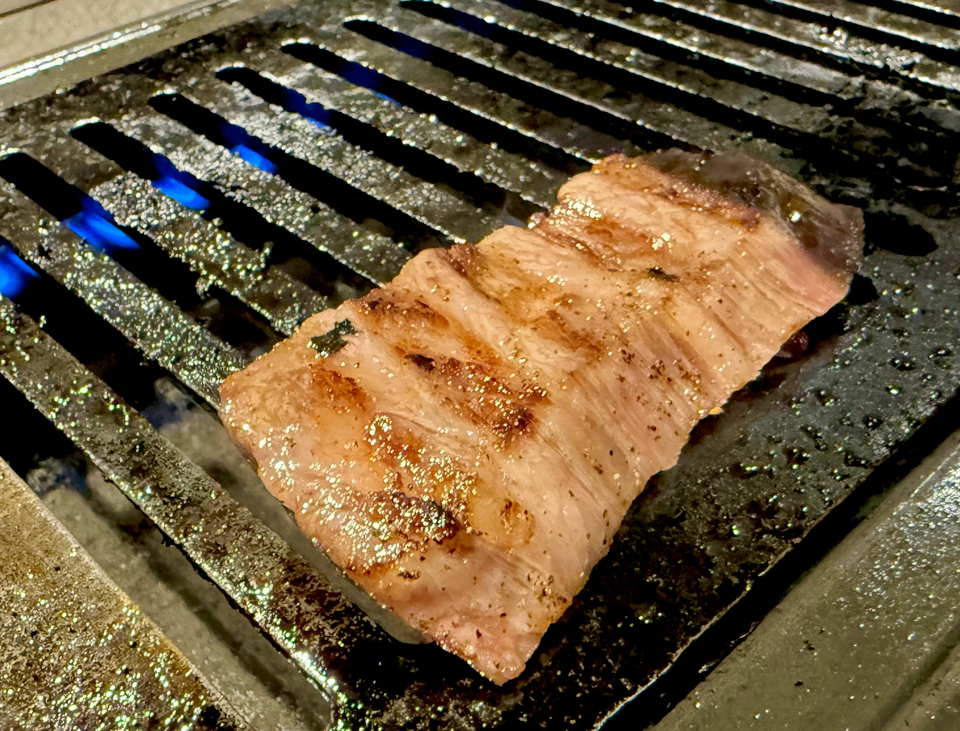 ‥和牛の脂で焼く時点で大勝利確定だよね。もしかして脂に触れる面積を増やすため、炭火と網じゃなくて鉄板を使うガス台だったりするのかしら。