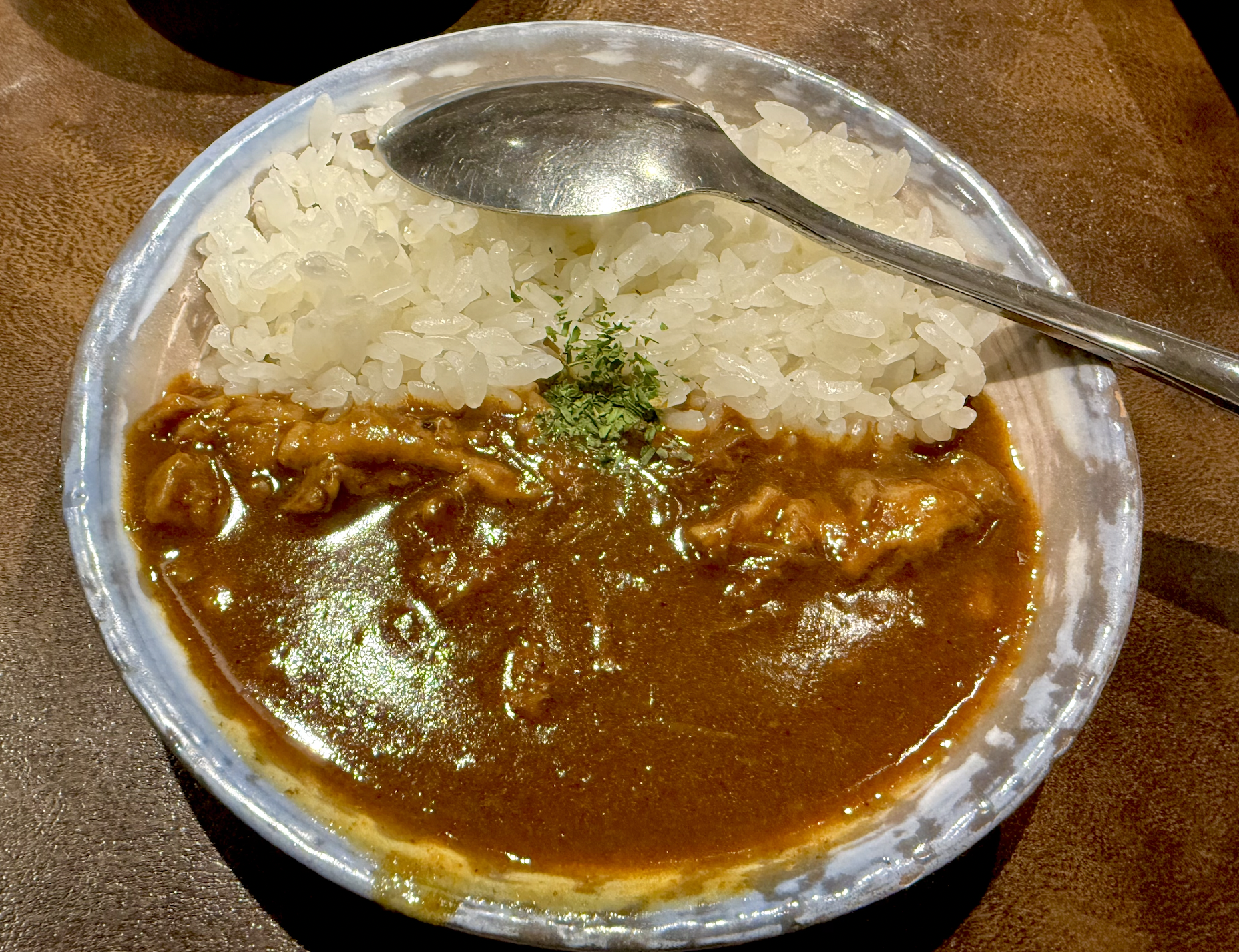 なんとなくわかってはいましたが、このカレーがまたンマーイ!スジとかその辺でしょうか、上等な牛の煮込んで旨い部分がふんだんに使われていて、ベースの旨味がエラいことになっている。